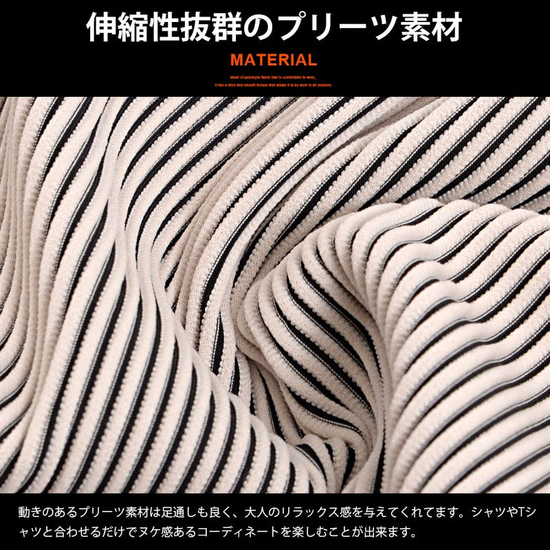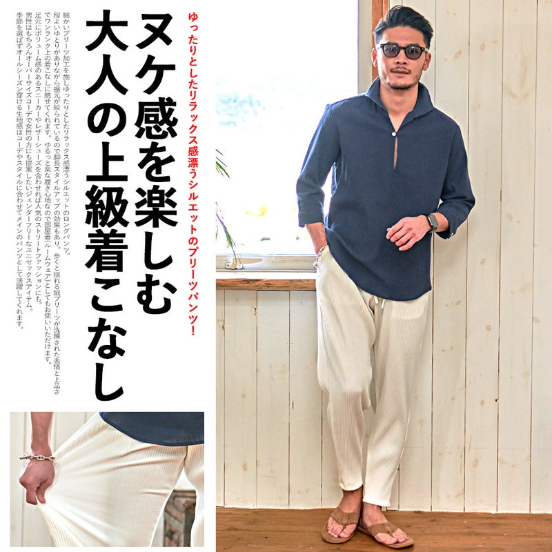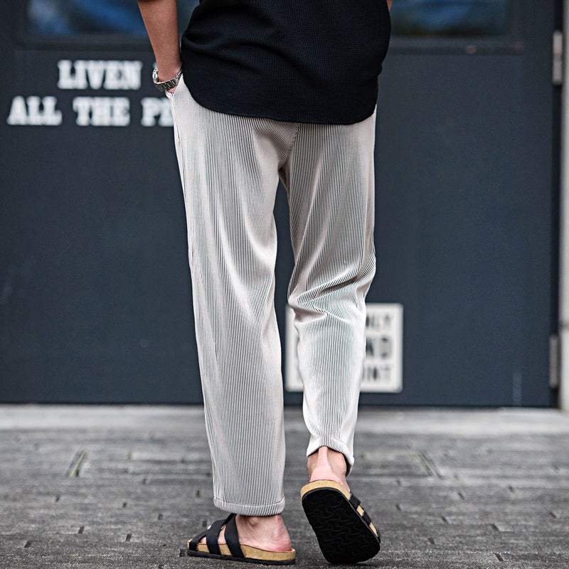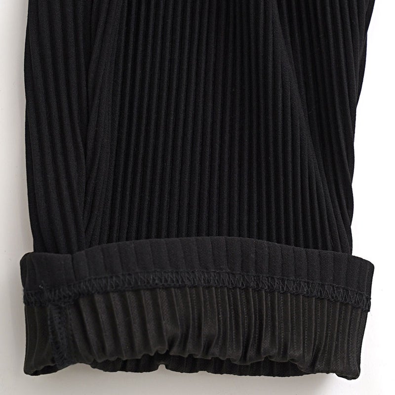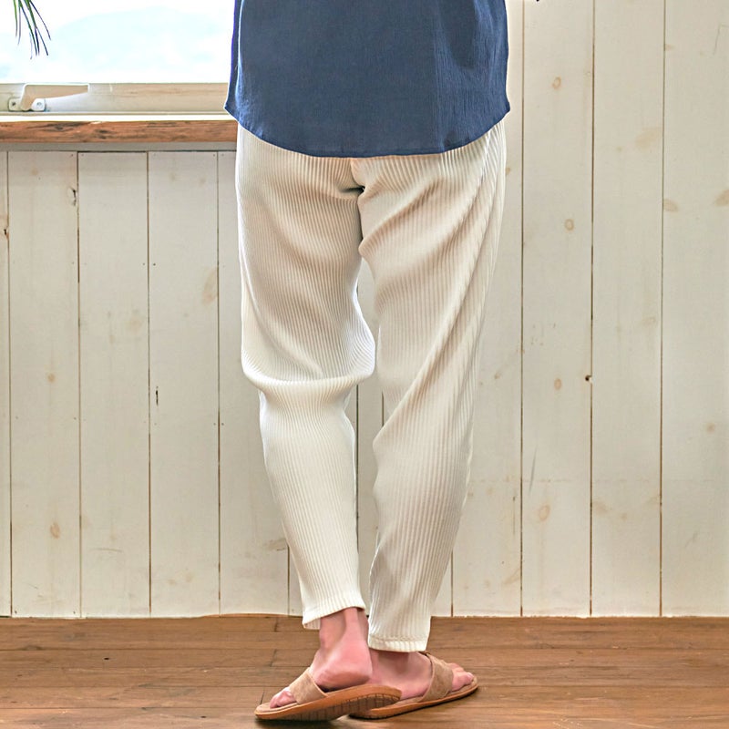 細かく施したプリーツ加工が特徴的な、上品さとリラックス感を兼ね備えたイージーパンツ。