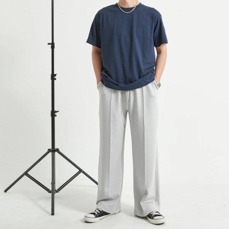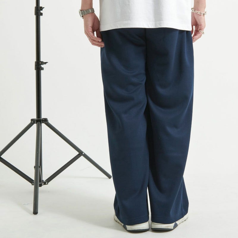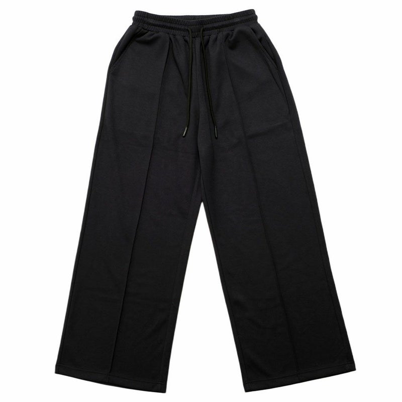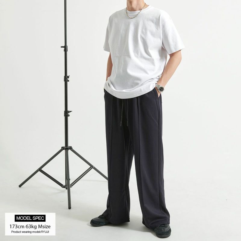 全体はリラックス感のあるワイドシルエットながら、中央に折り目をつけたセンタープレス仕様で、 野暮ったく見せず、すっきりとした印象を演出。