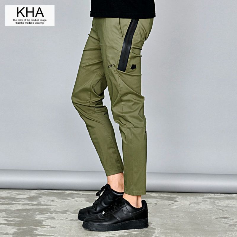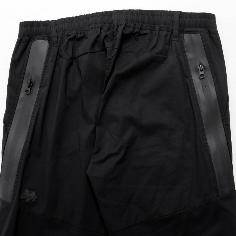 両サイドのポケットには止水ジップを採用し、ももにはワンポイントのラバーワッペンを配置。
