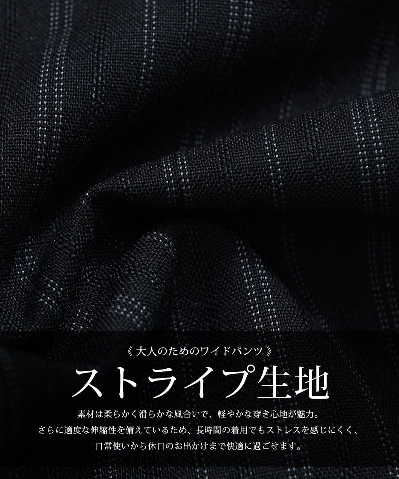 ゆったりとしたシルエットと上品なストライプ柄を組み合わせた、大人のためのワイドパンツです。