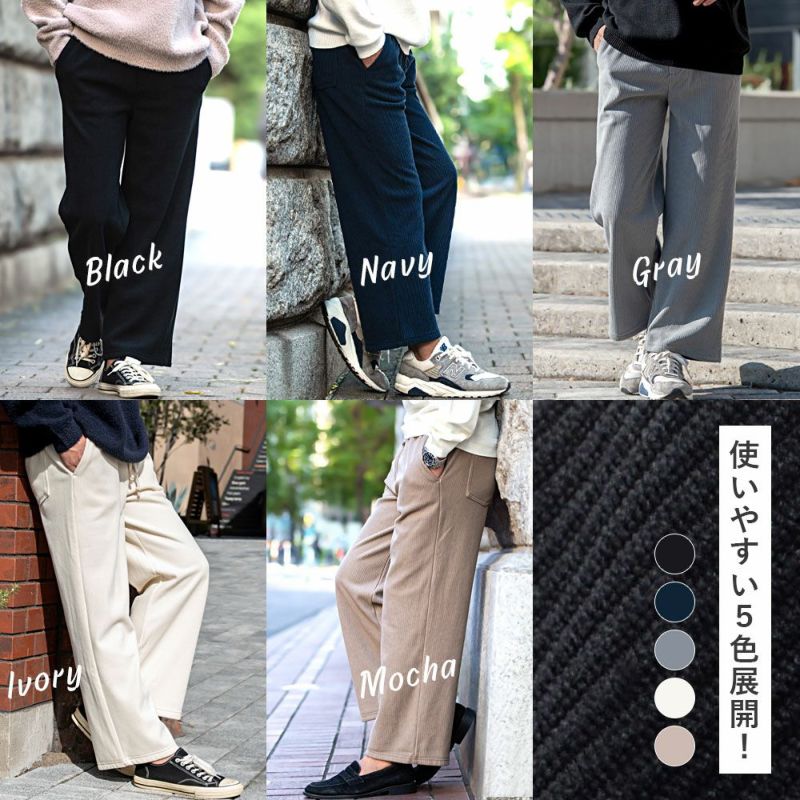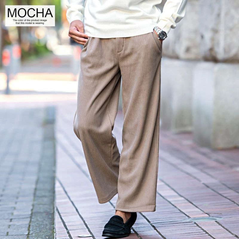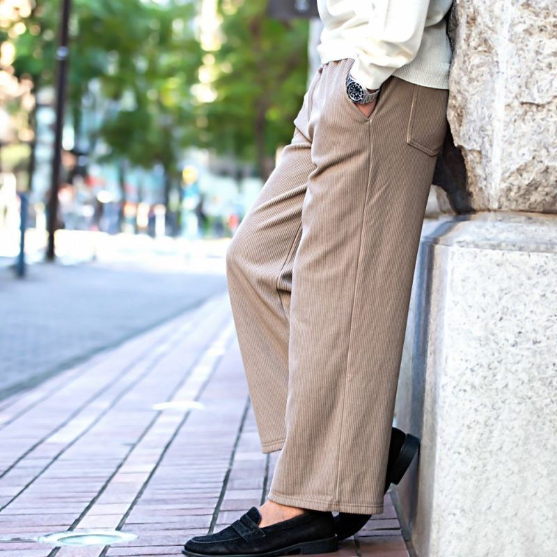 コーデュロイの素材感と広がりすぎない、ストレートワイドシルエットでスッキリ贅沢ワイドパンツ。