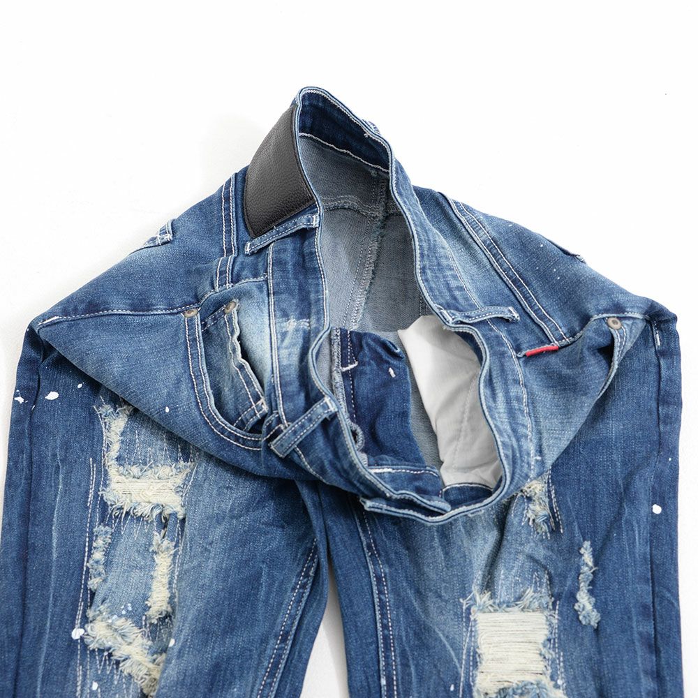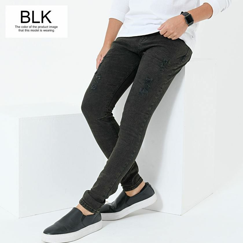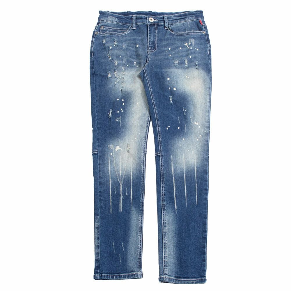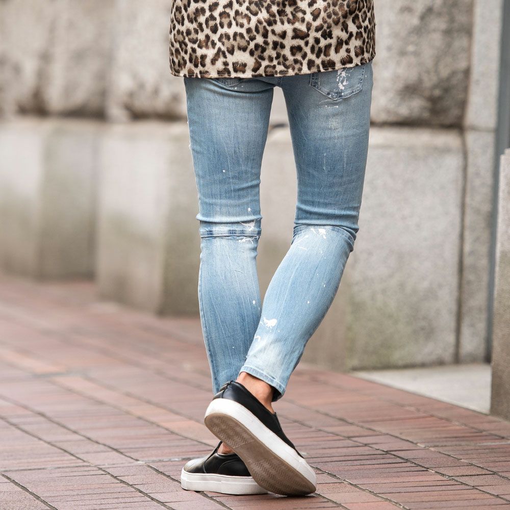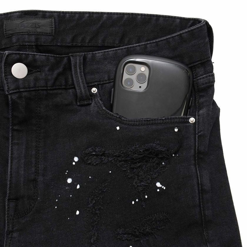 毎日のコーデに欠かせない、定番デニムパンツ。シンプルで着回し力抜群。 CavariA(キャバリア)ペンキ飛ばしダメージ加工ストレッチスキニーデニムパンツ/全2色
