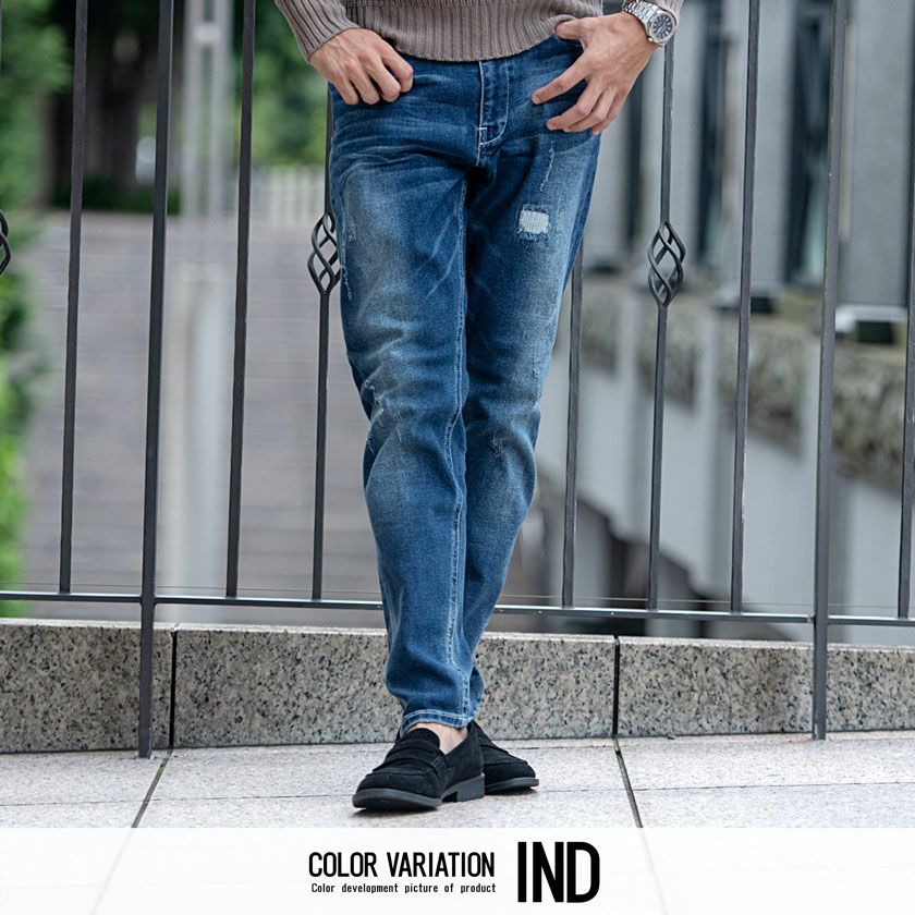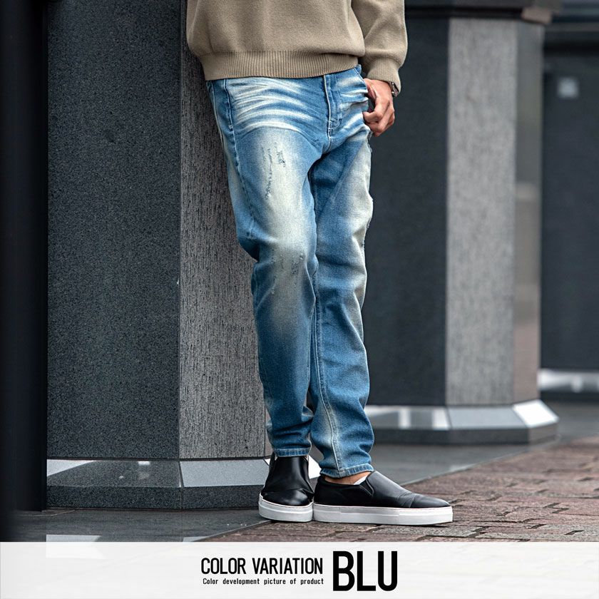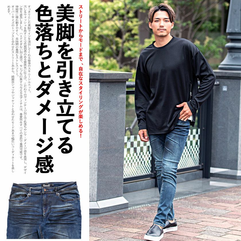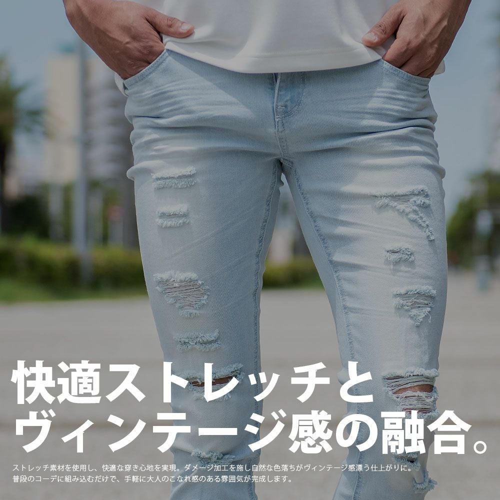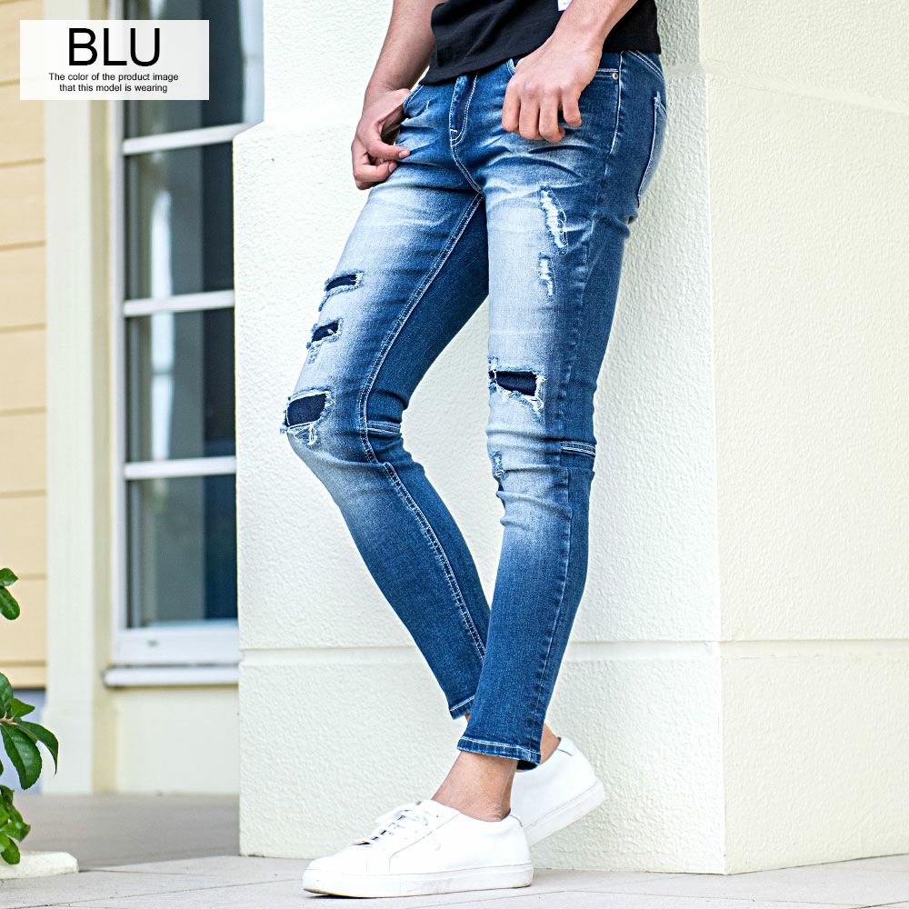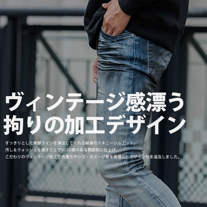 デニムパンツ メンズ スキニーパンツ スキニーデニム ジーンズ ジーパン アンクル丈 アンクルデニム アンクルパンツ Gパン ストレッチ 細身 スリム タイト ダメージ CavariA(キャバリア)リペア立体ヒゲストレッチスキニーアンクルデニムパンツ/全3色