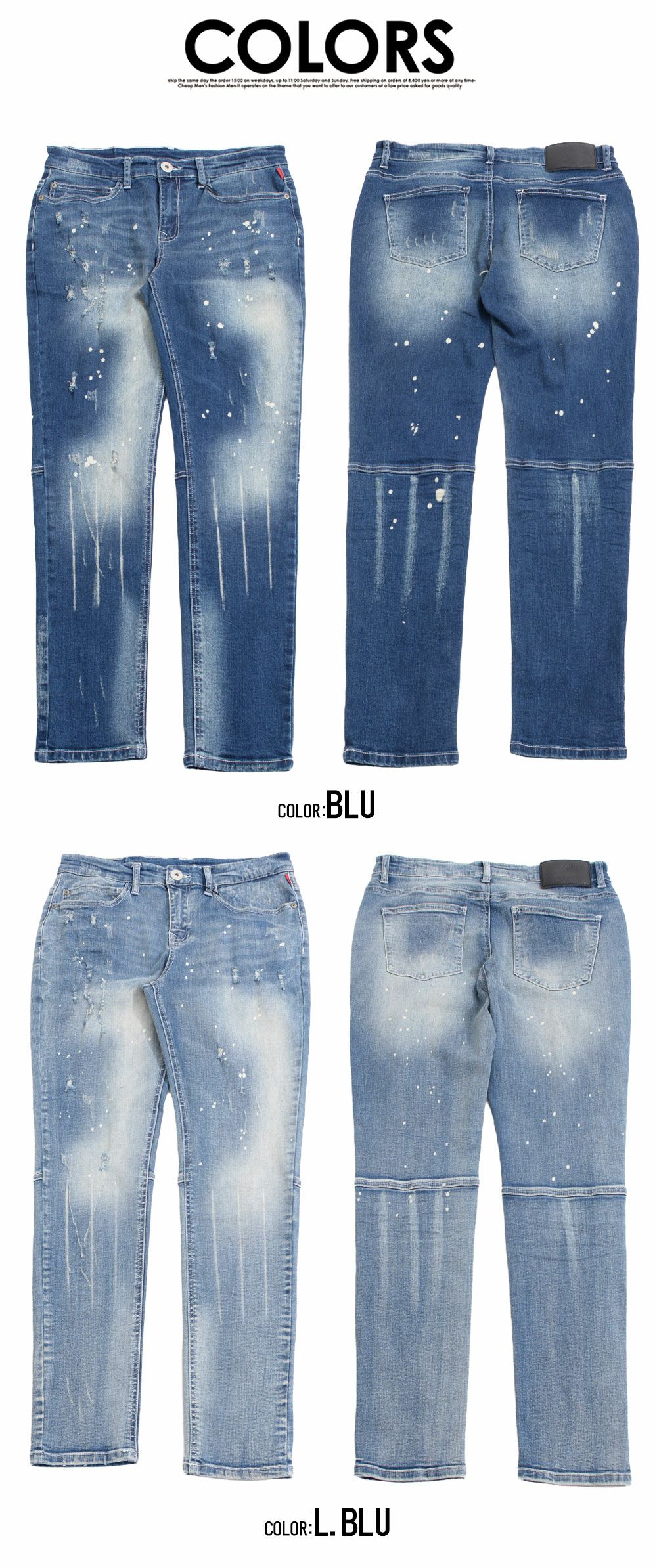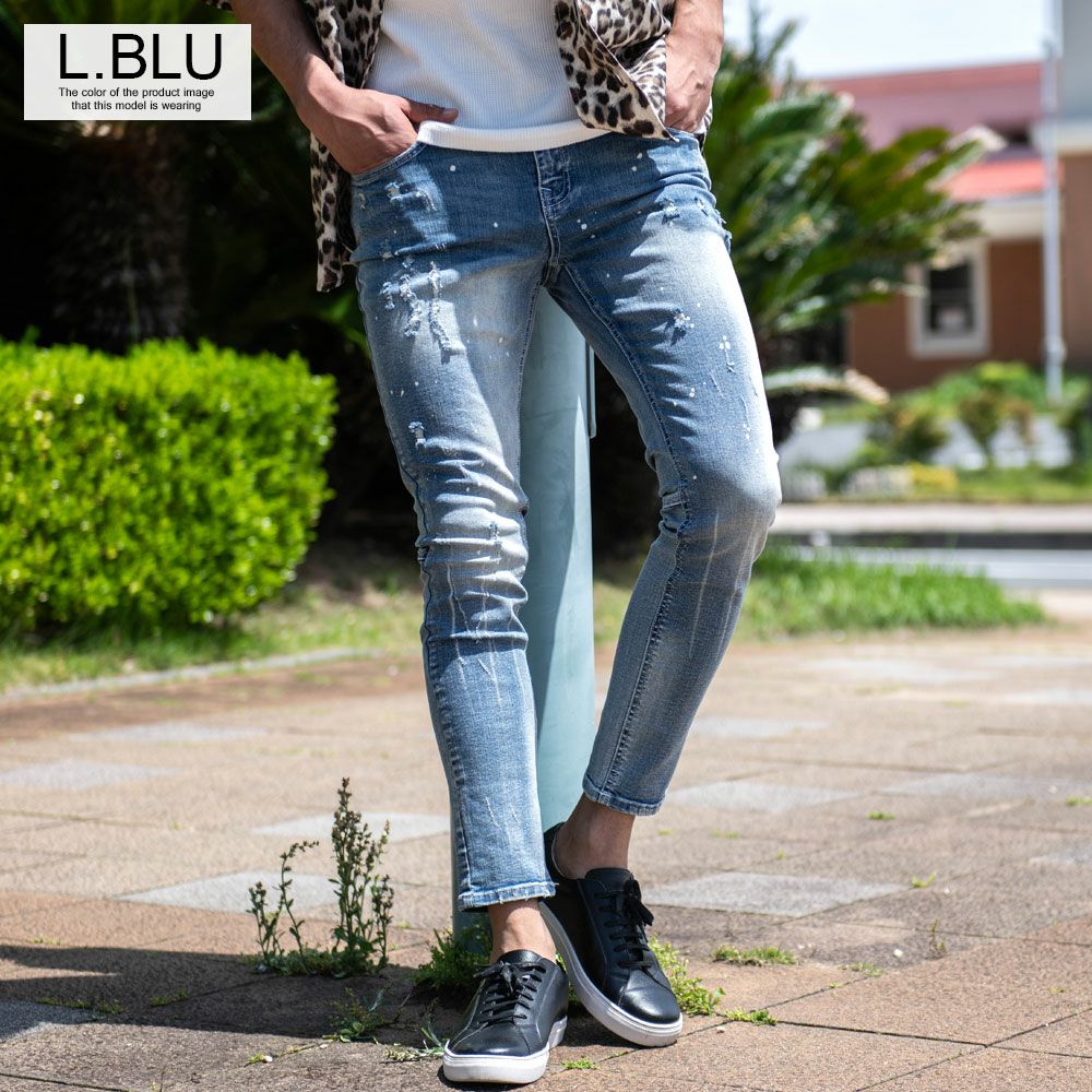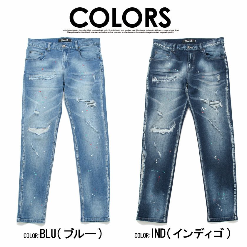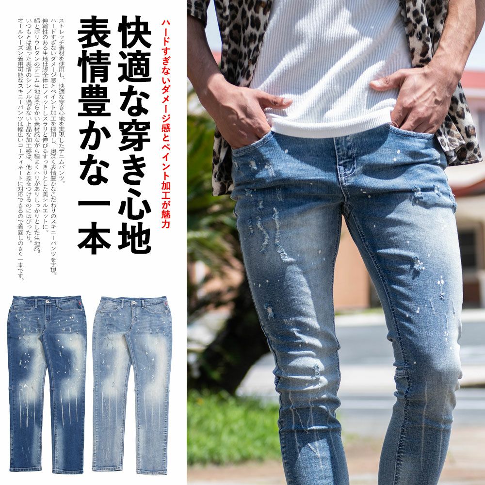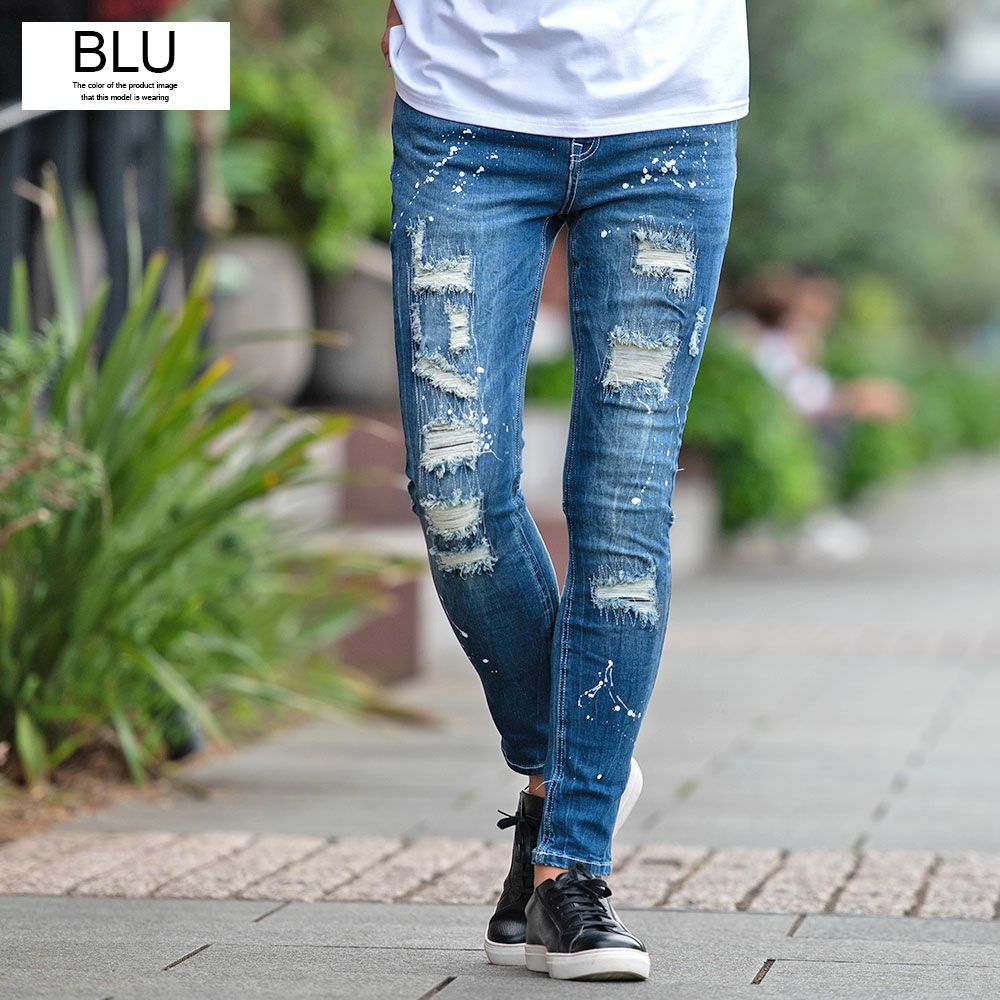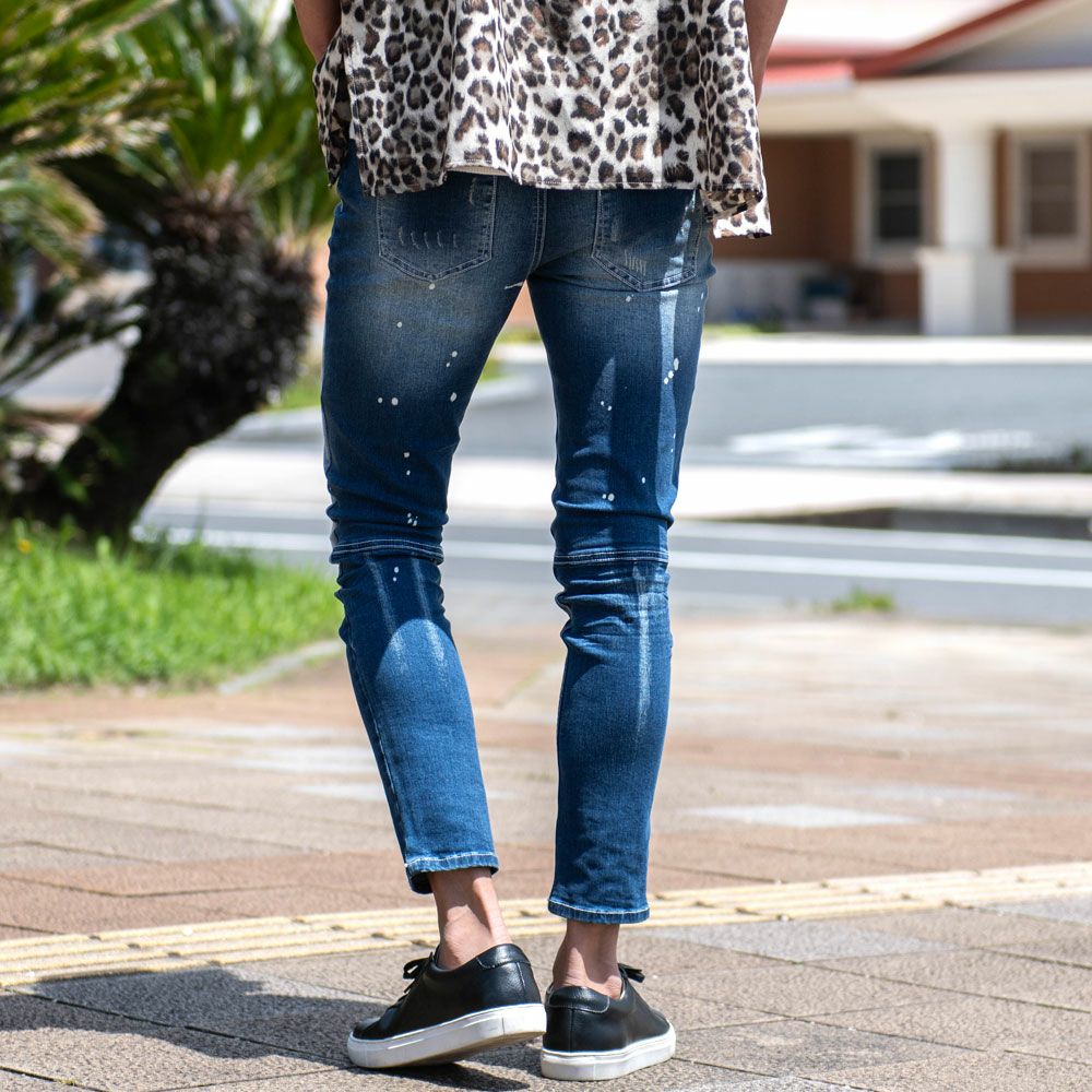 デニムパンツ メンズ ダメージ おしゃれ ペイント スキニーパンツ 伸縮性 ブルー ユニセックス 美シルエット CavariA キャバリア 夏 夏服 春 春服 ファッション CavariA(キャバリア)ペインティングストレッチスキニーアンクルデニムパンツ/全2色