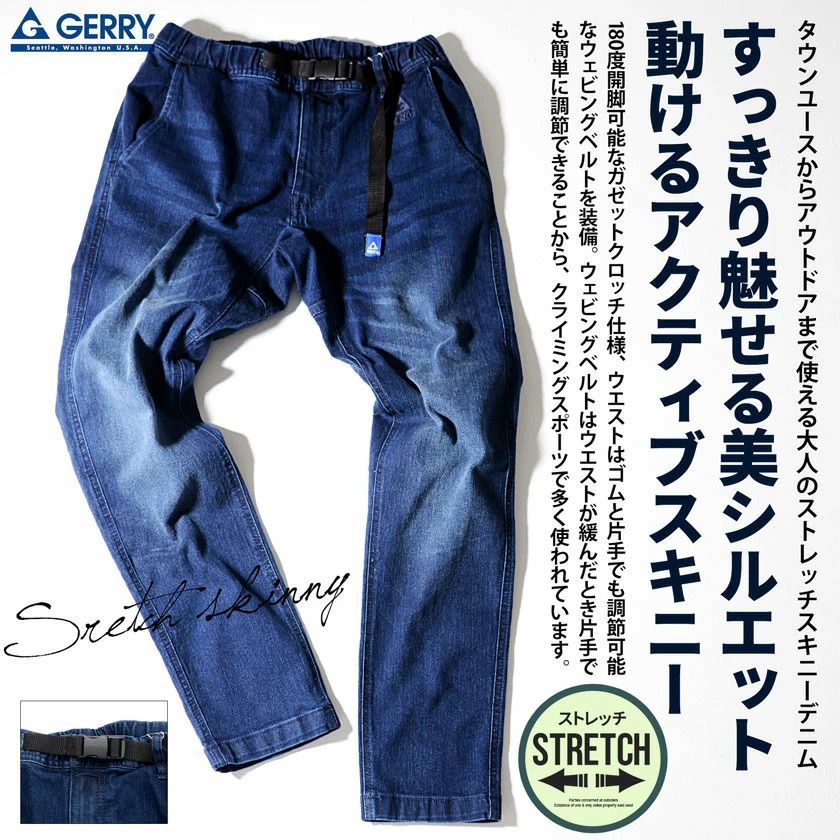 抜群のフィット感と動きやすさを併せ持ち、美シルエットに魅せるスキニーパンツ。180度開脚可能なガゼットクロッチ仕様、ウエストはゴムと片手でも調節可能なウェビングベルトを装備。 GERRY(ジェリー)UVストレッチスキニーテーパードデニムパンツ/全3色