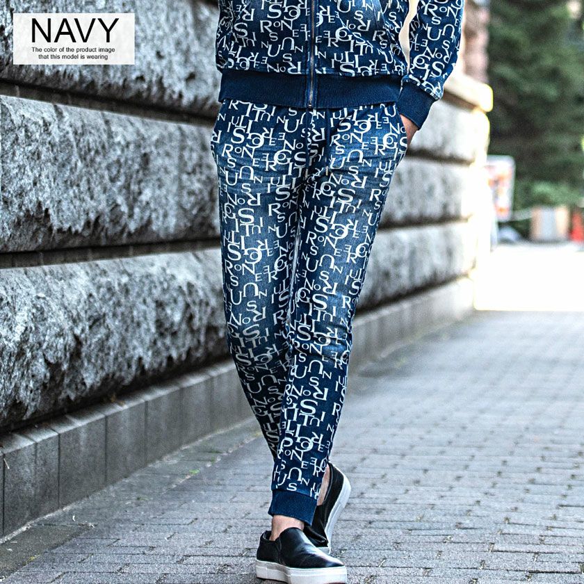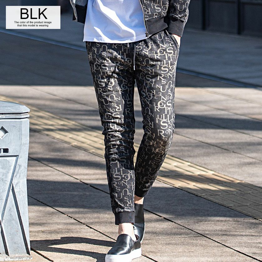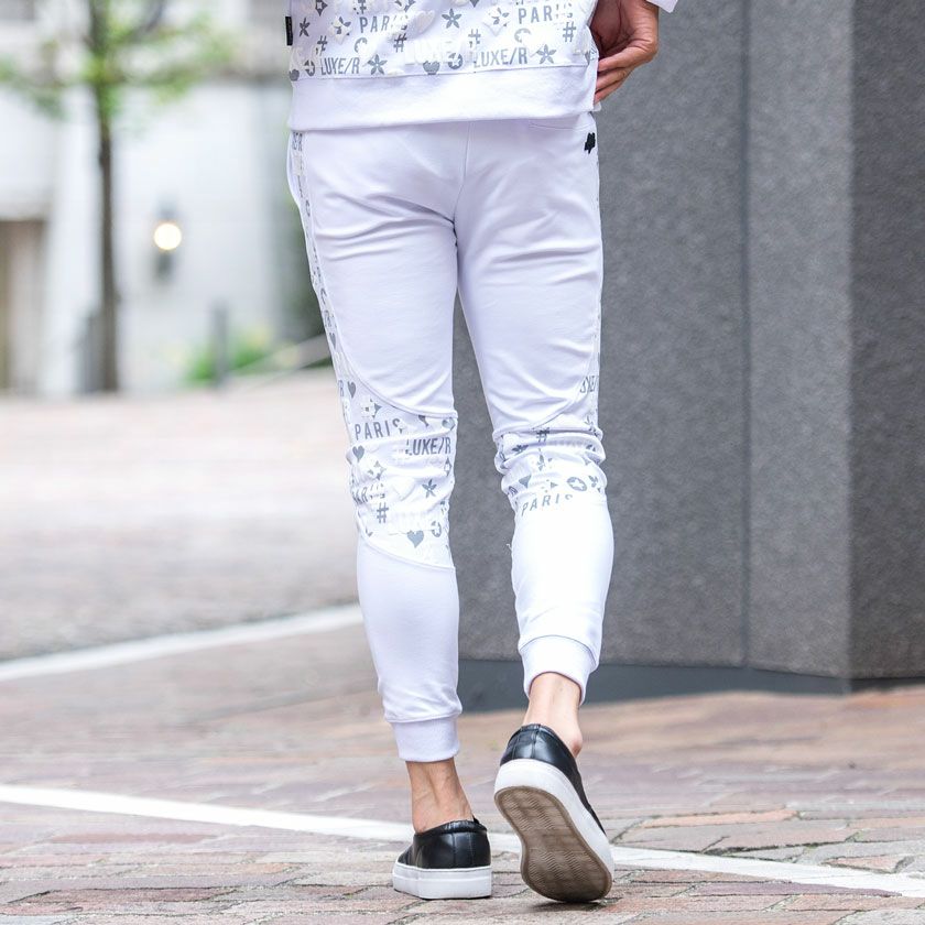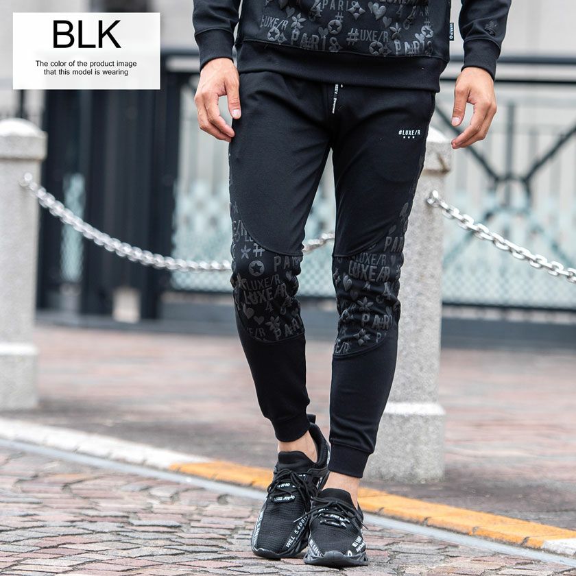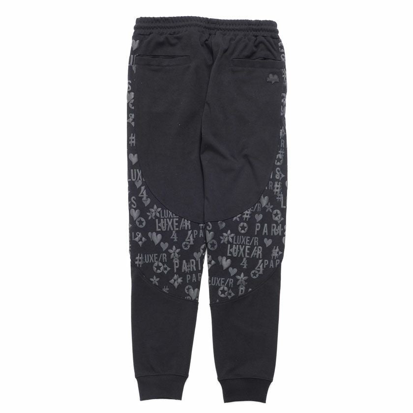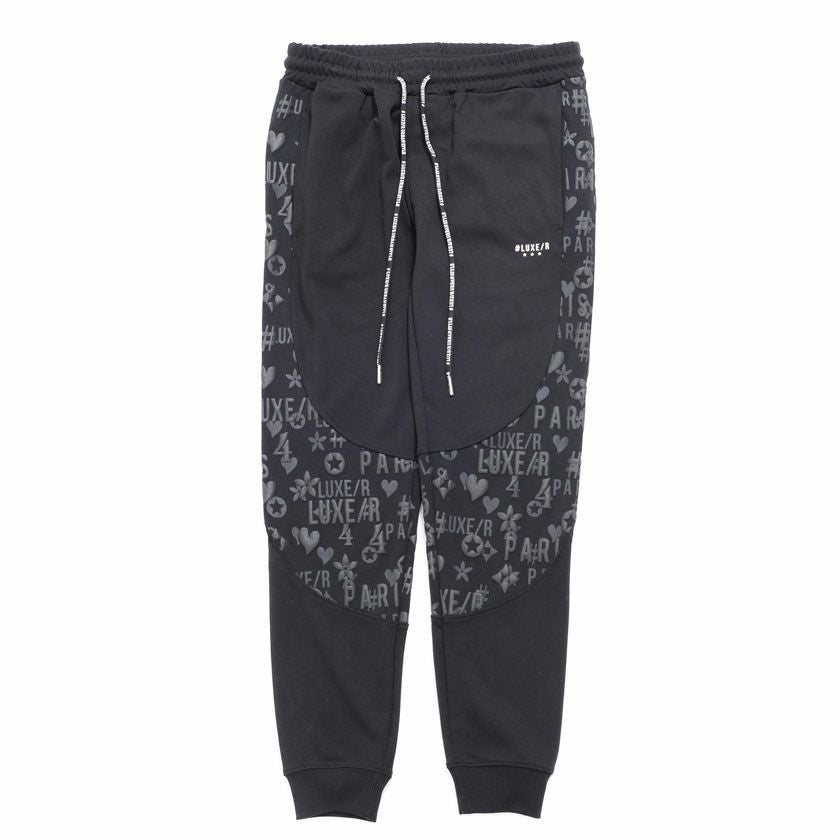 毎日履きたい、快適でおしゃれなスウェットパンツ。カジュアルスタイルに最適。 LUXE/R(ラグジュ)切り替え総柄ロゴジョガーパンツ/全3色