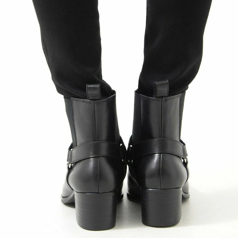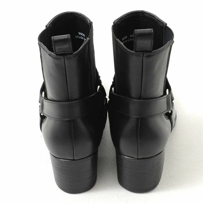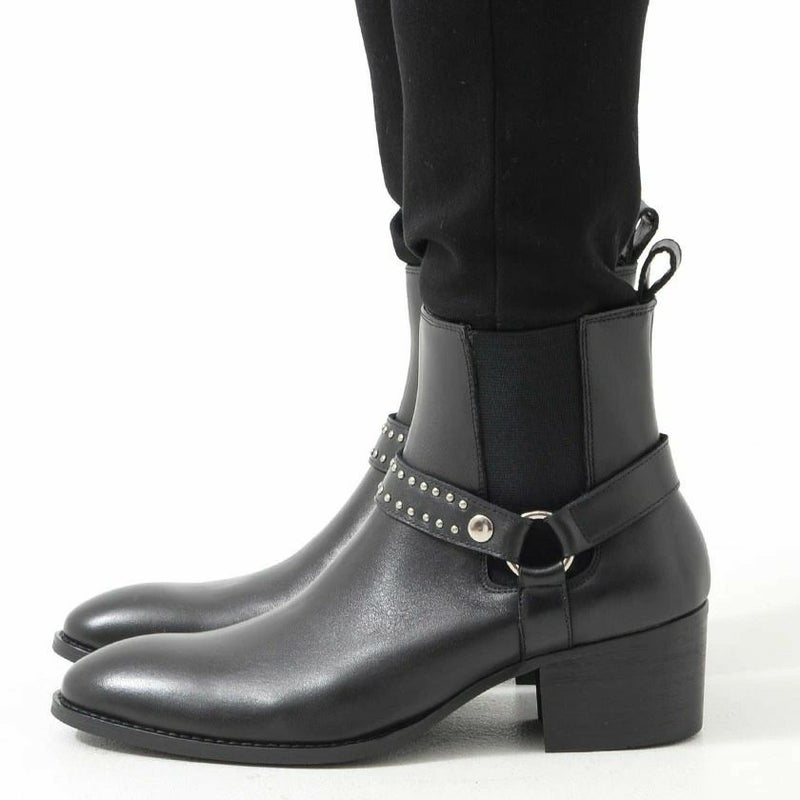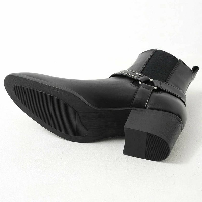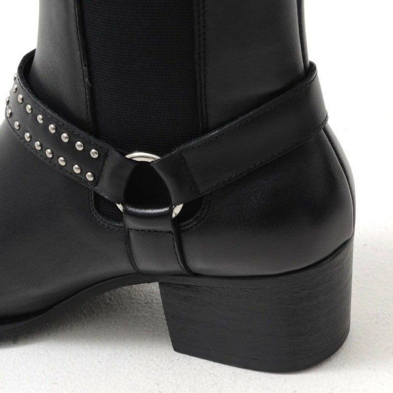 ロングノーズのシャープなフォルムに、スタッズをあしらったリングベルトがクールな存在感のあるハイヒールブーツ。
