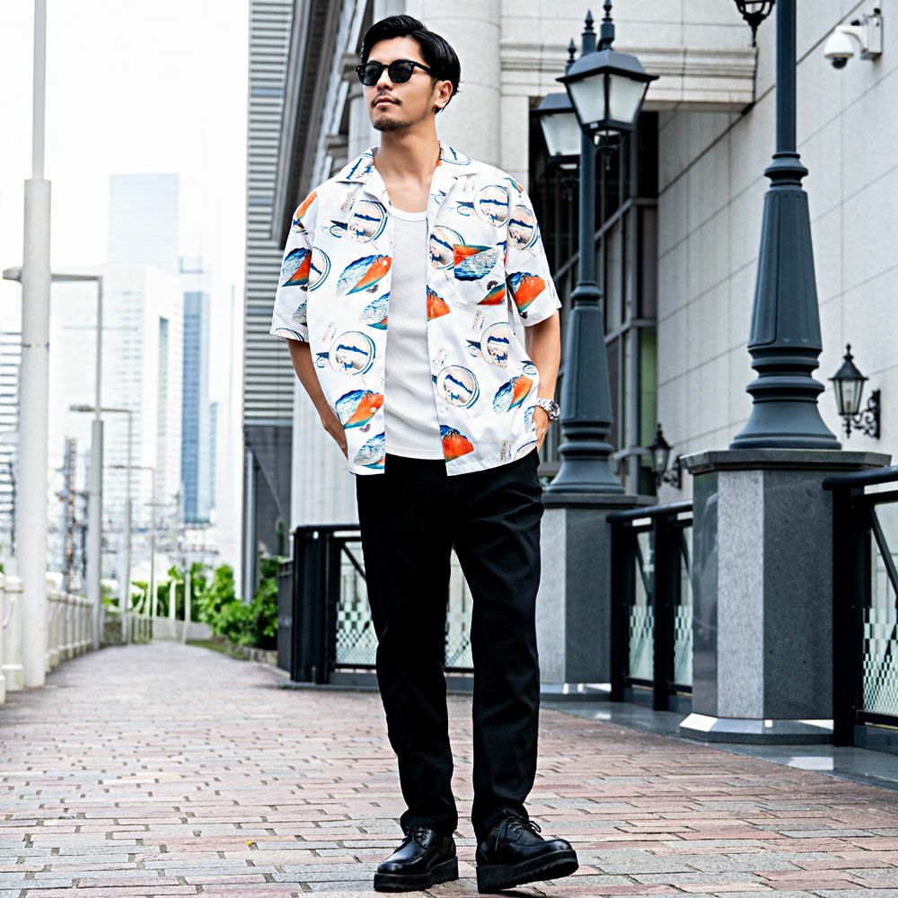 胸元には実用的なポケットを、裾には動きやすさを高めるスリットを配置。オープンカラー仕様でアロハシャツのようにラフに羽織るだけで、コーディネートの主役になる存在感を放ちます。