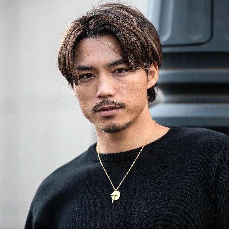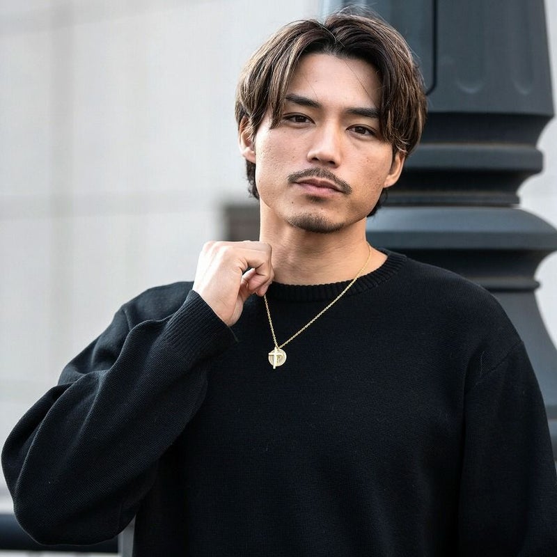 コインとクロスをモチーフにしたネックレスが煌びやかに輝きを放ち、首元に存在感を醸し出してくれます。