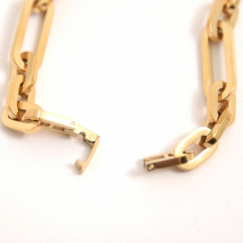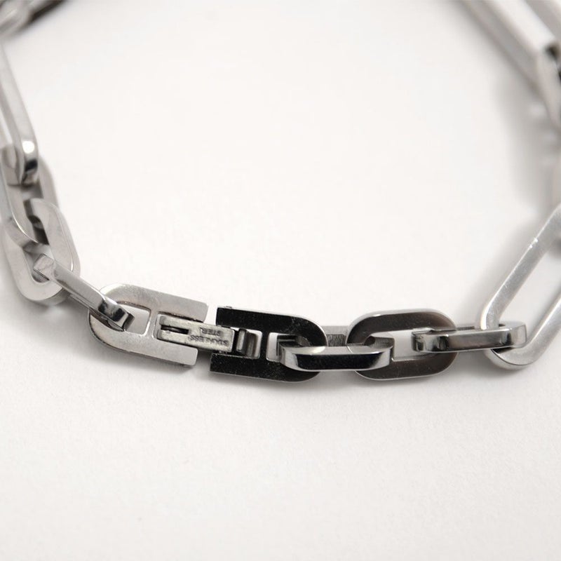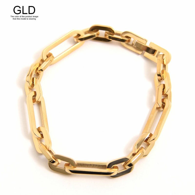 大きさの異なる楕円形の輪を繋ぎ合わせたオーバルミックスチェーンブレスレット。