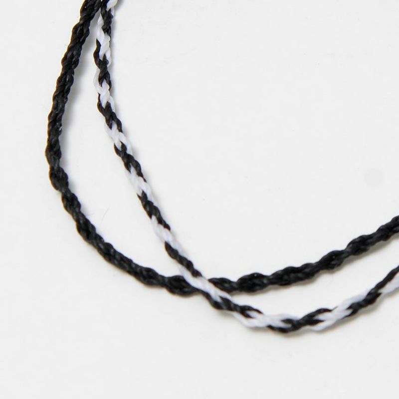 ポリエステル素材のワックスコードで編みこんであり、留め具やパーツは国産具材を使用しております。