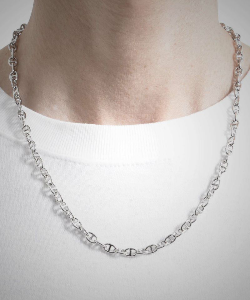 重厚感のある円型チェーンが首元に存在感を醸し出してくれます。