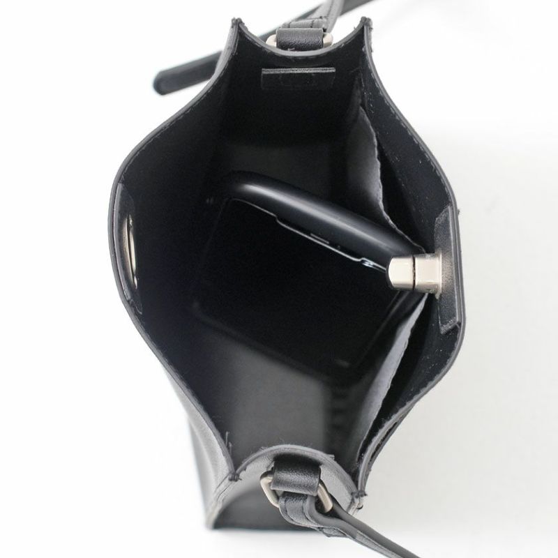 PUレザーを一枚革風に仕立てた素材を使用した、かっちりとした仕上がりのミニショルダーバッグ。