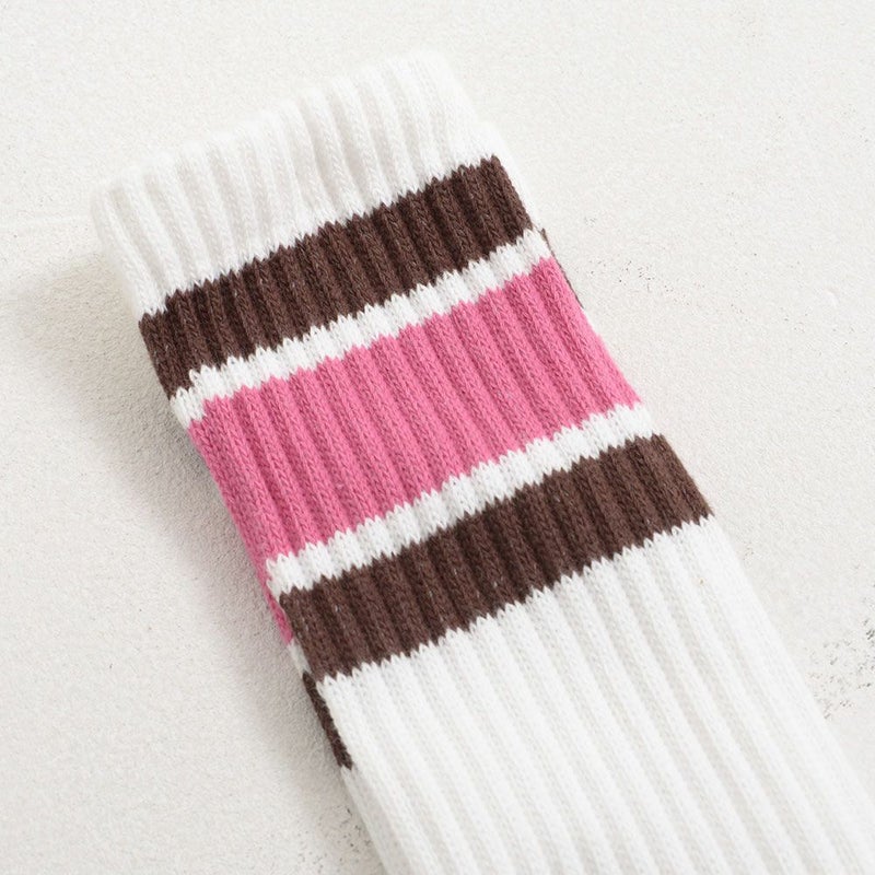 クッション性とコンプレッション機能を備えクルー丈(ふくらはぎくらいの長さ)のソックス。