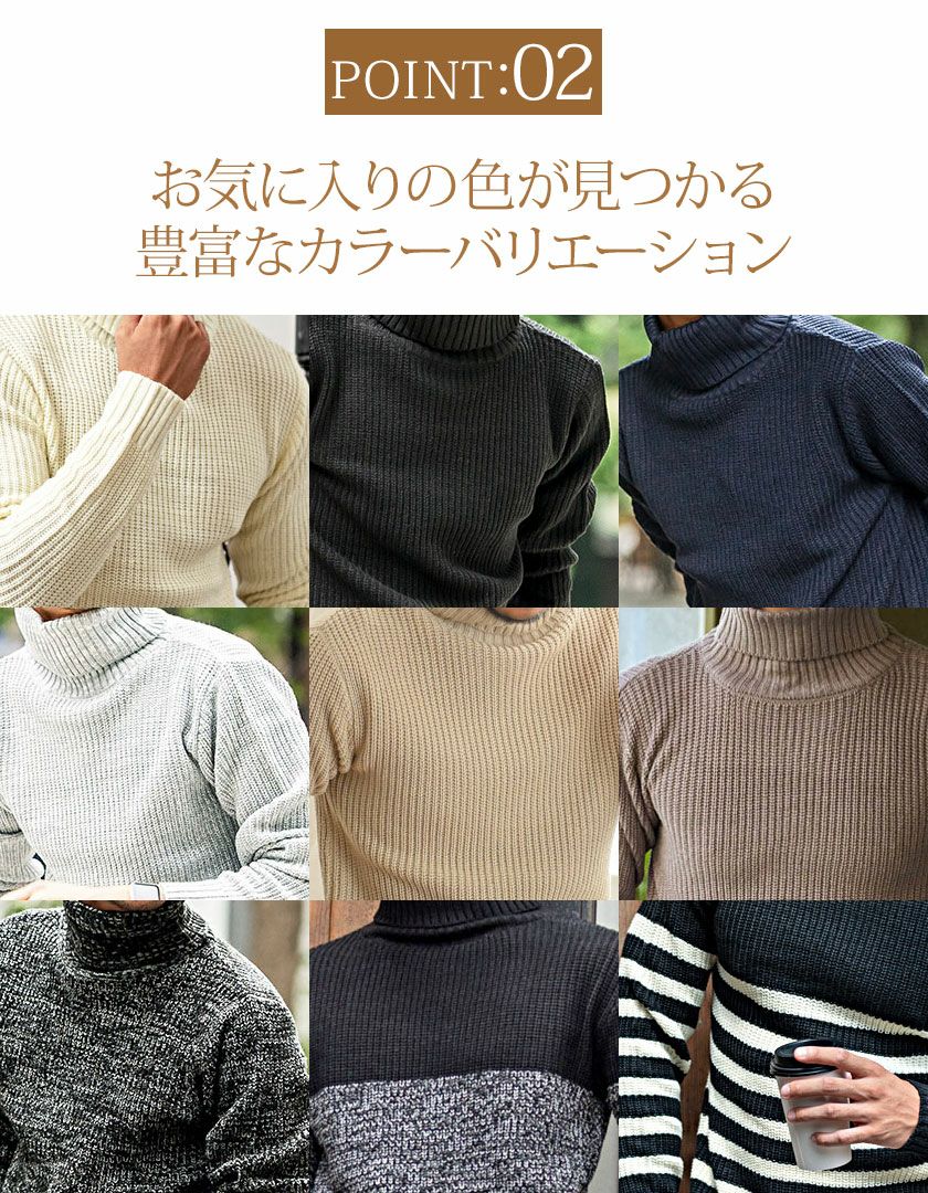 ネックラインはややボリュームのあるタートルネック仕様で、首元までしっかり暖かく、上品で落ち着いた大人の雰囲気を演出。