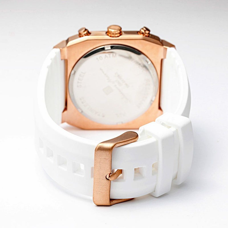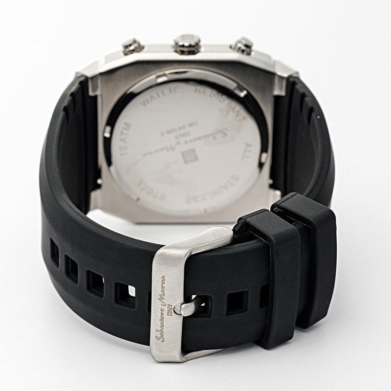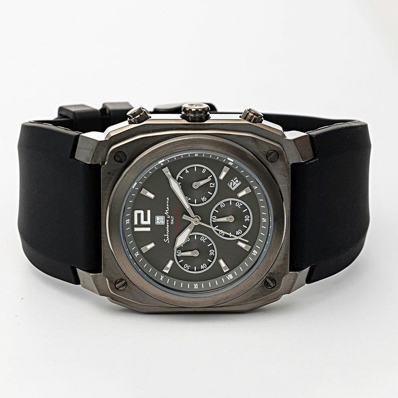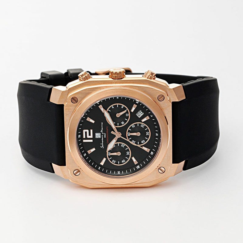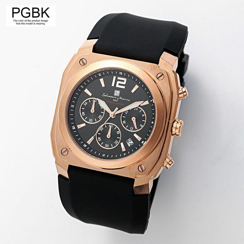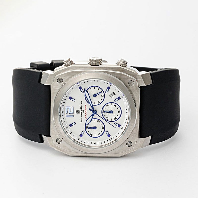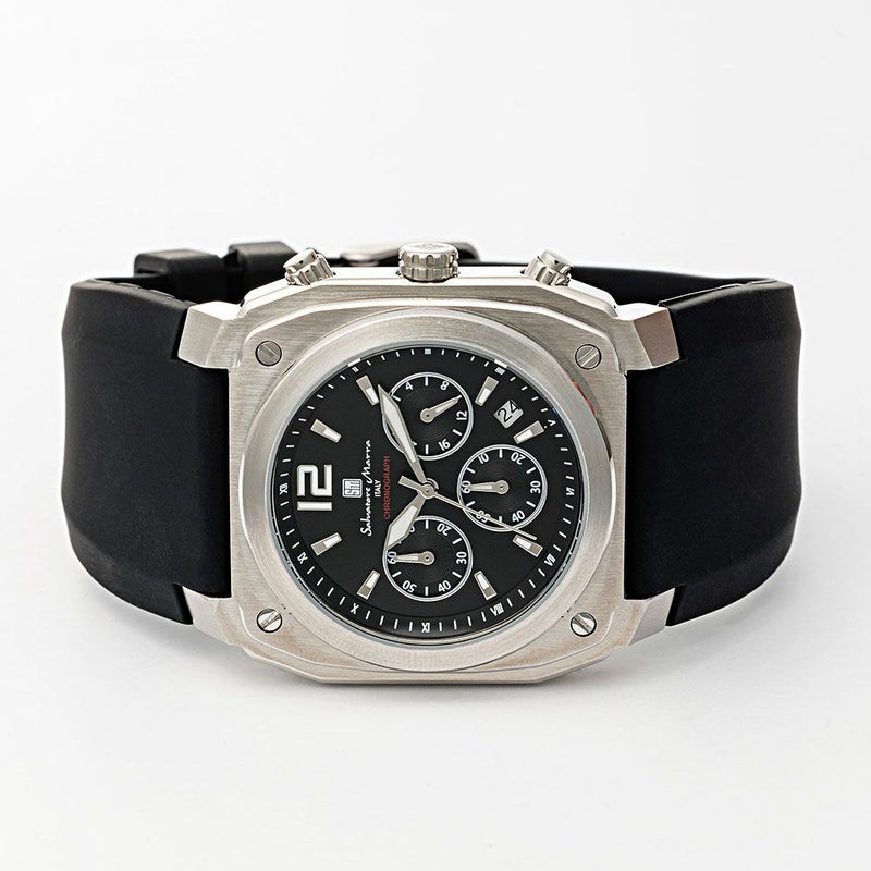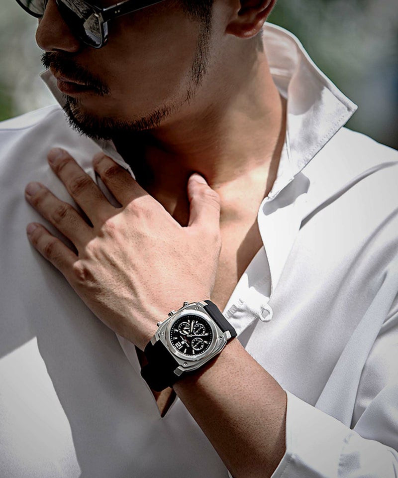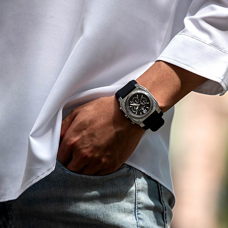 堅牢な印象のスクエア(クッション)ケースがインパクトのあるクロノグラフ。