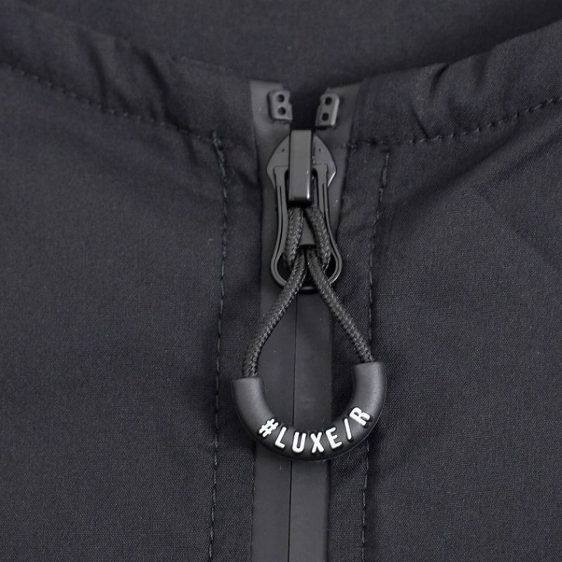 両サイドのポケットとフロントジップのテープ部分に特殊なフィルムがラミネートされた防水仕様の止水ファスナーを採用しました。