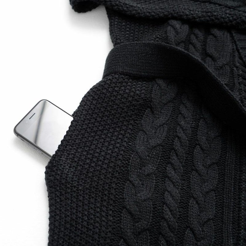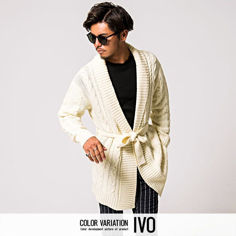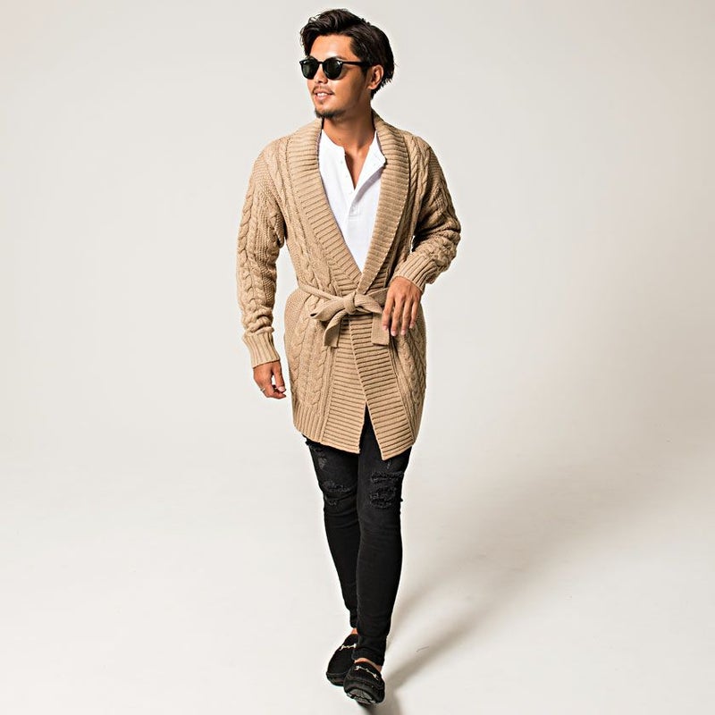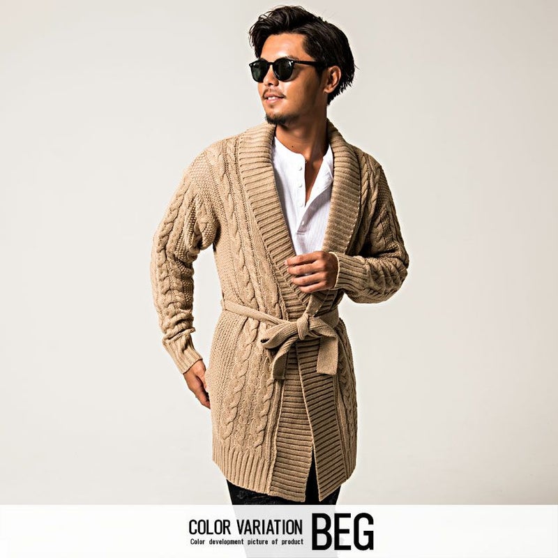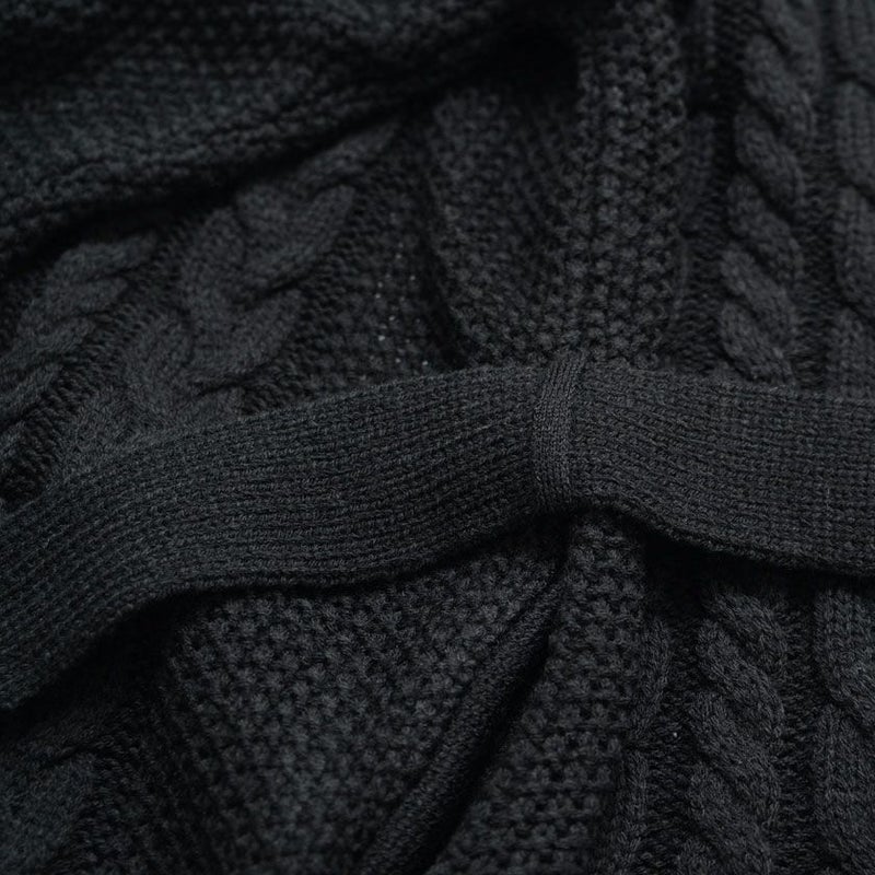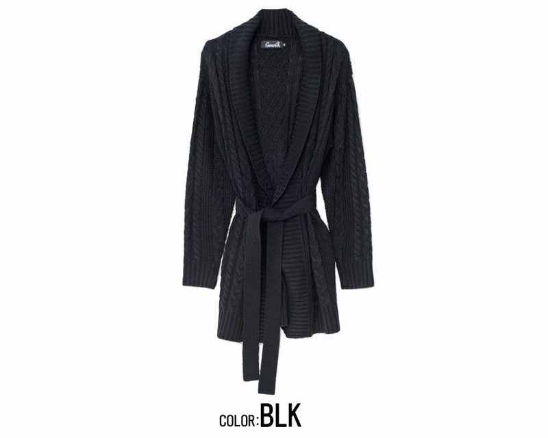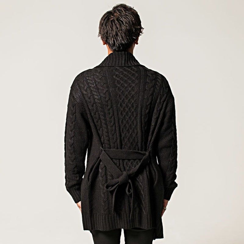 三つ編みのような柄が縦に施されたケーブル編みが特徴のショールカラーガウン。
