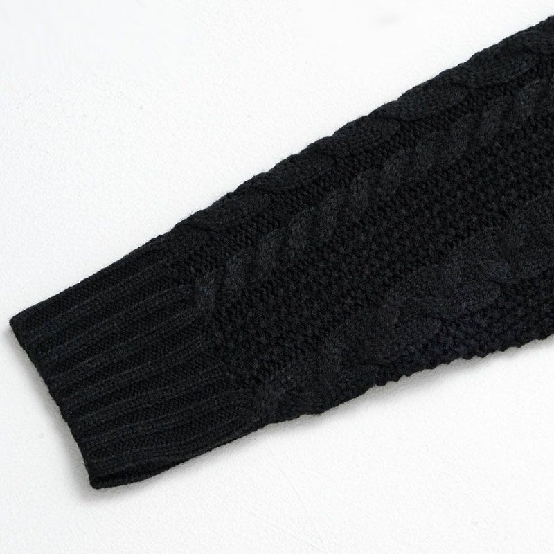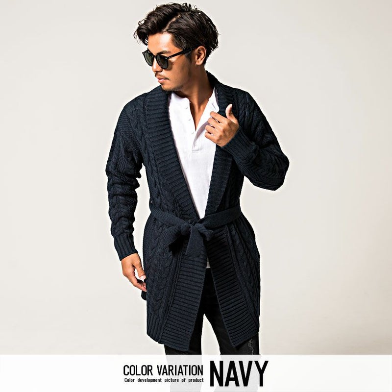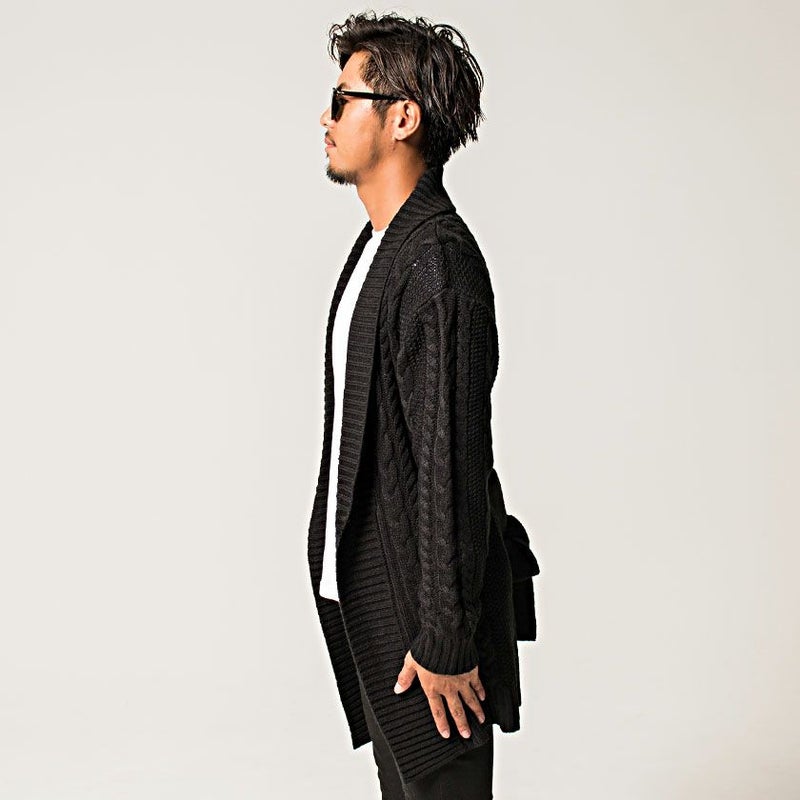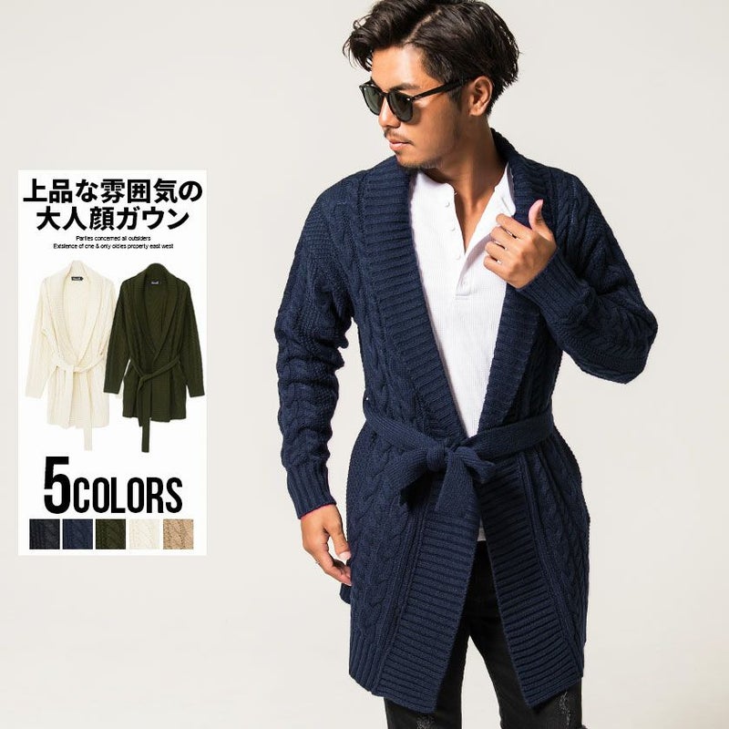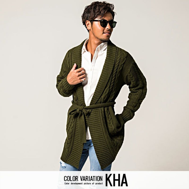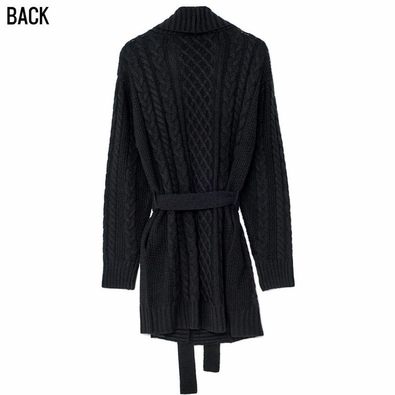三つ編みのような柄が縦に施されたケーブル編みが特徴のショールカラーガウン。