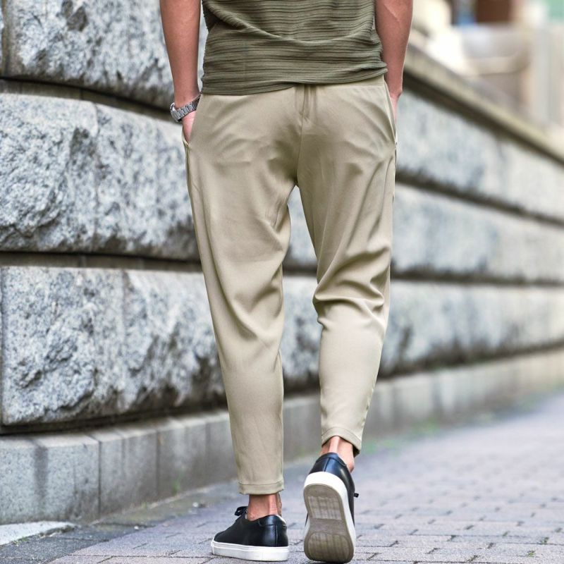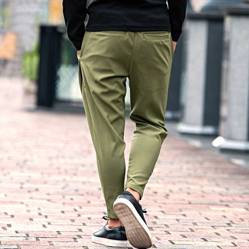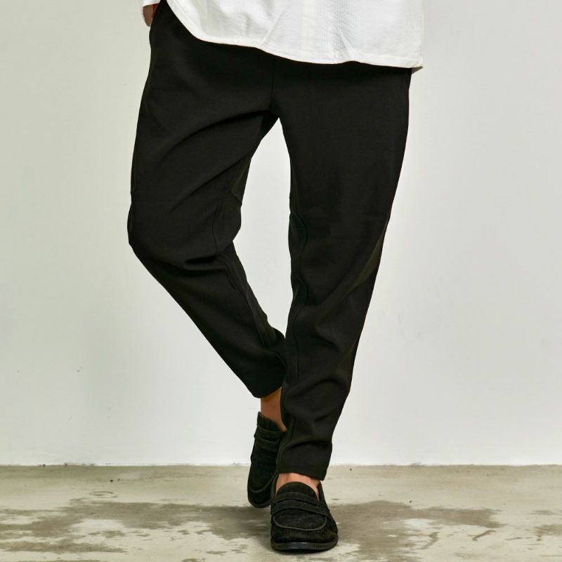 上品でドライな質感が特徴の生地を使用したテーパードタイプのパンツ。