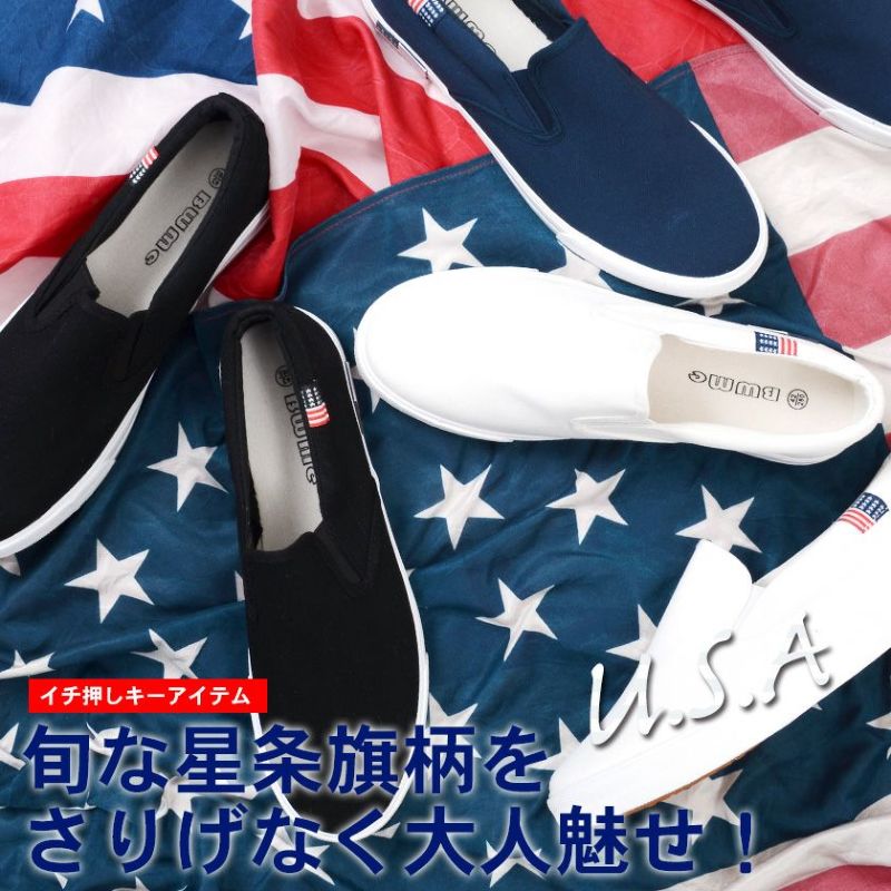 ゴムテープ部分のサイドラインも足元をちらりと彩るコーデのポイントに。スリッポンタイプなので着脱もスムーズに行え柔軟性、通気性もよく履き心地は抜群です。 Bitter select(ビターセレクト)星条旗柄ワンポイントスリッポンスニーカー/全3色