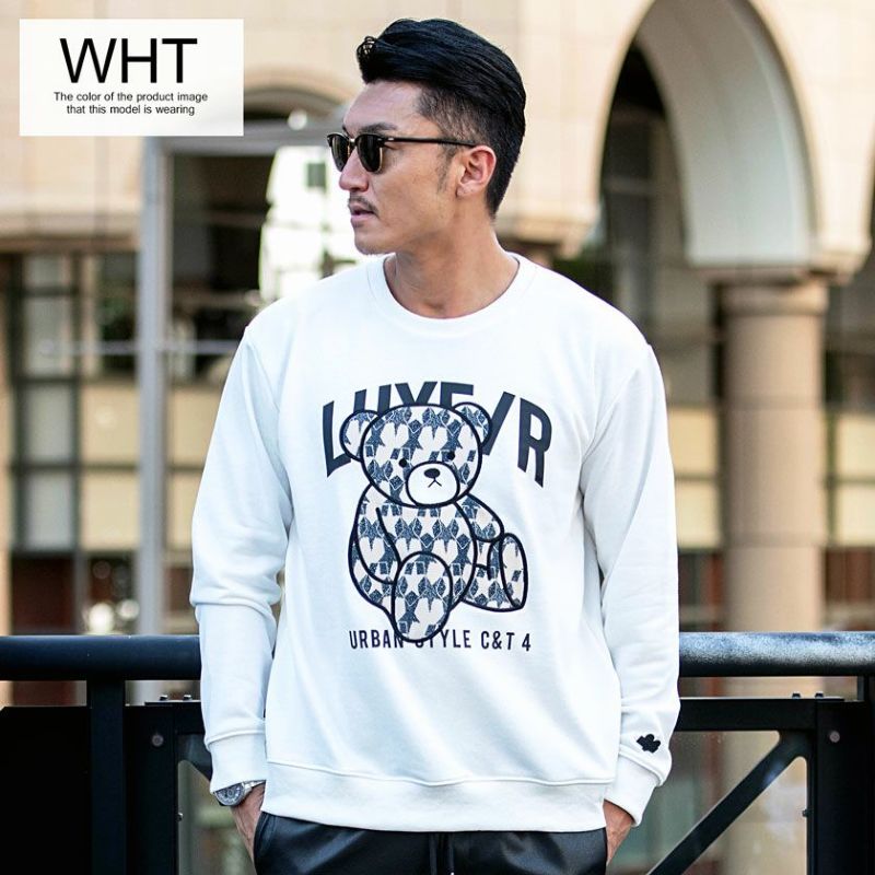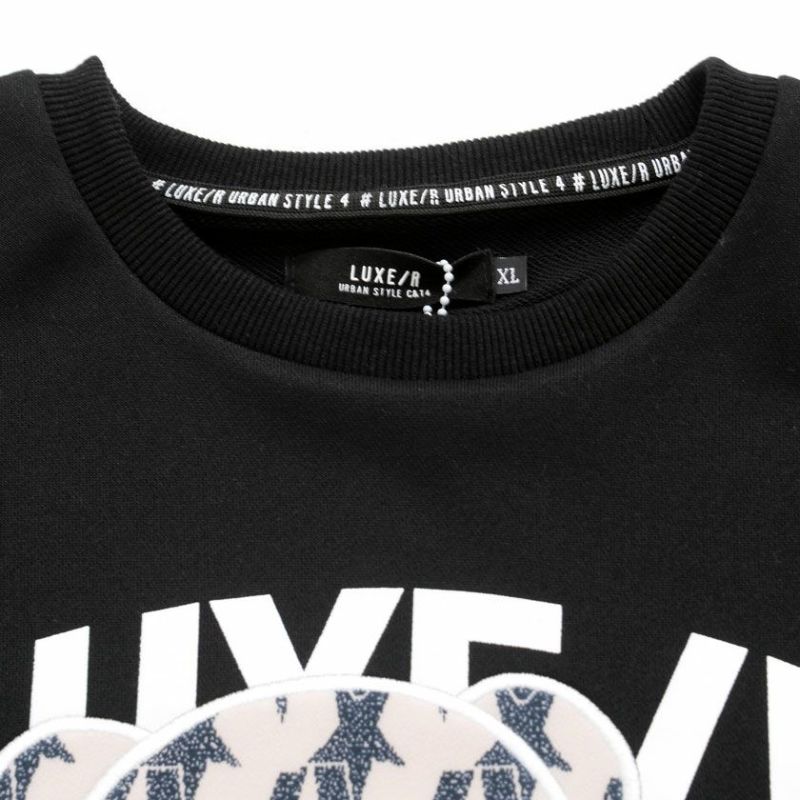 1枚で着ても、レイヤードにも最適な長袖Tシャツ。使い勝手抜群の定番アイテム。 LUXE/R(ラグジュ)クルーネック ジャガードプリント貼り付けベアトレーナー 長袖Tシャツ/全3色