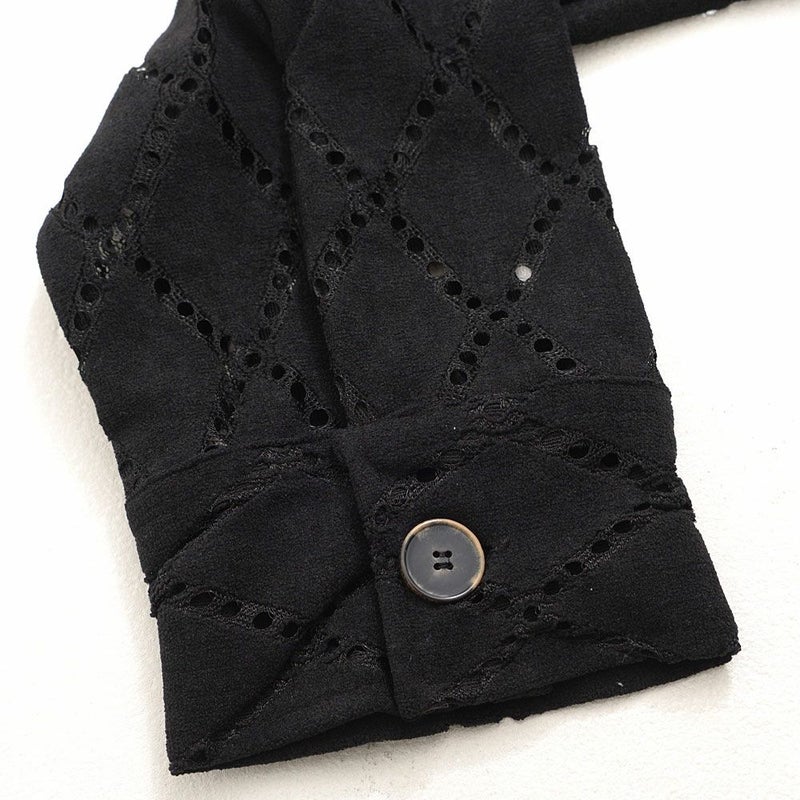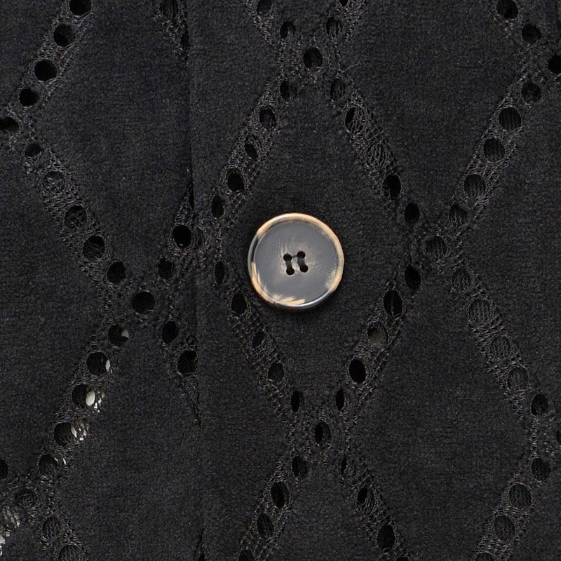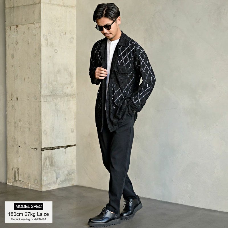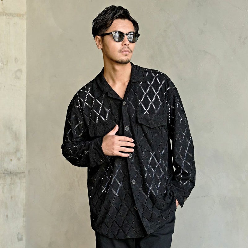 細かく繊細なダイヤ柄がレース調の雰囲気を生み出し、さらっと羽織るだけで“いつものコーデを一段上へ”引き上げてくれる存在感抜群の一枚です。