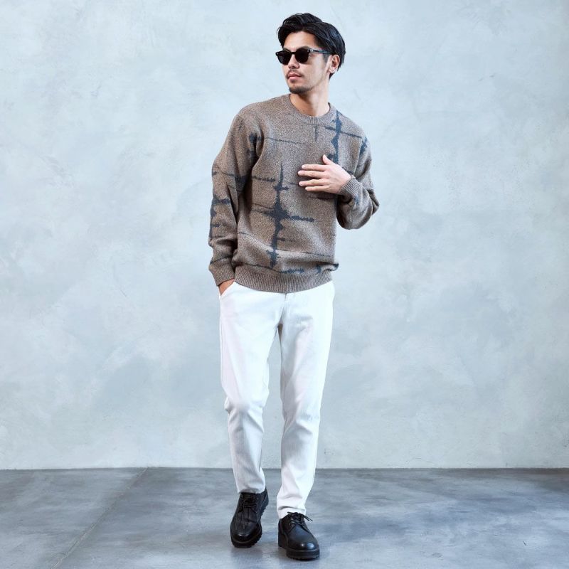 シンプルになりがちな秋冬コーデに奥行きと個性を添え、1枚で主役として存在感を発揮するデザインニット。