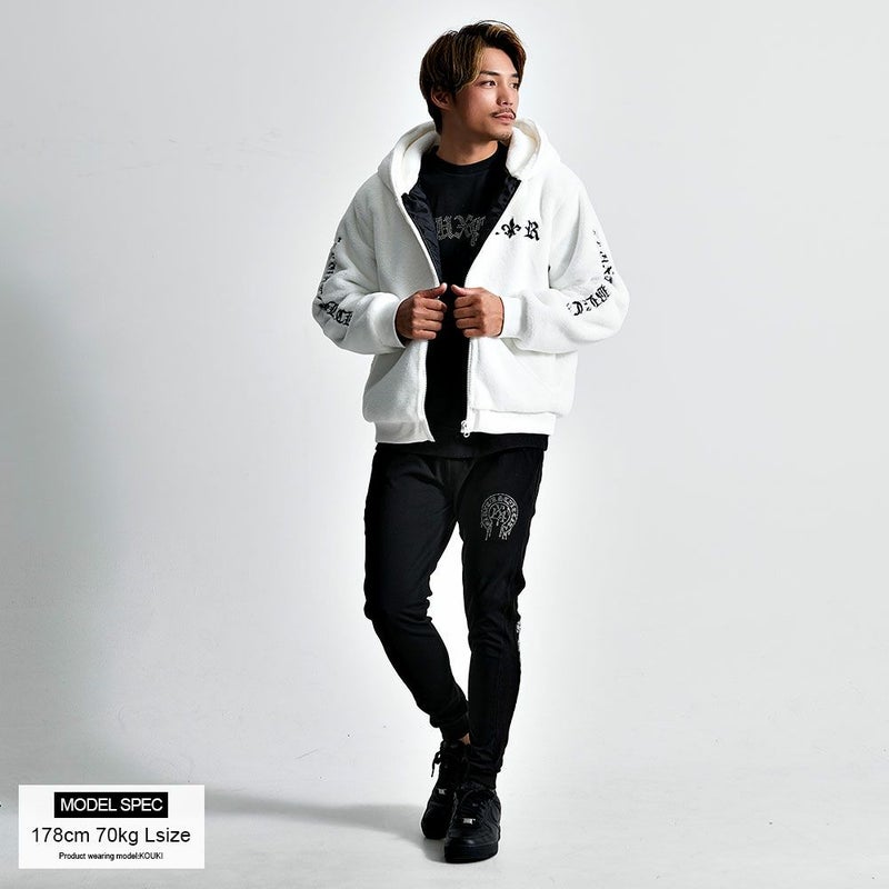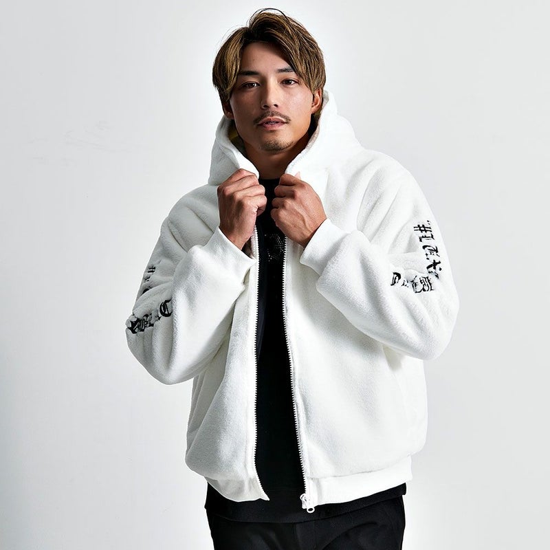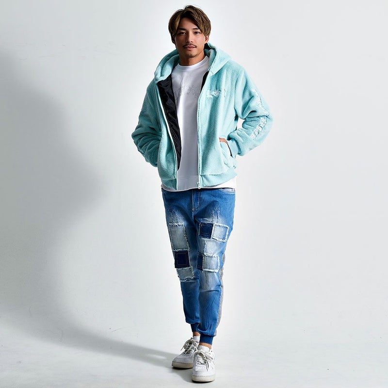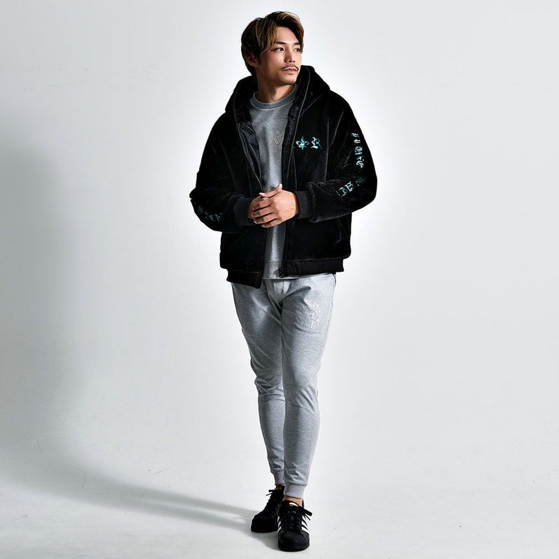 ふんわりとした毛並みが上品さを演出しつつ、胸元とバック、袖に施された立体的な刺繍がストリート感を際立たせ、存在感のあるルックスに仕上がっています。