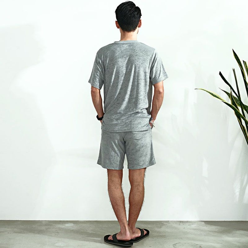 上はクルーネックの半袖Tシャツ、下はショートパンツのセットとなっており、夏のお家スタイルから近所まで、コーディネートに困らず、単品でも使えるオシャレなアイテムです。