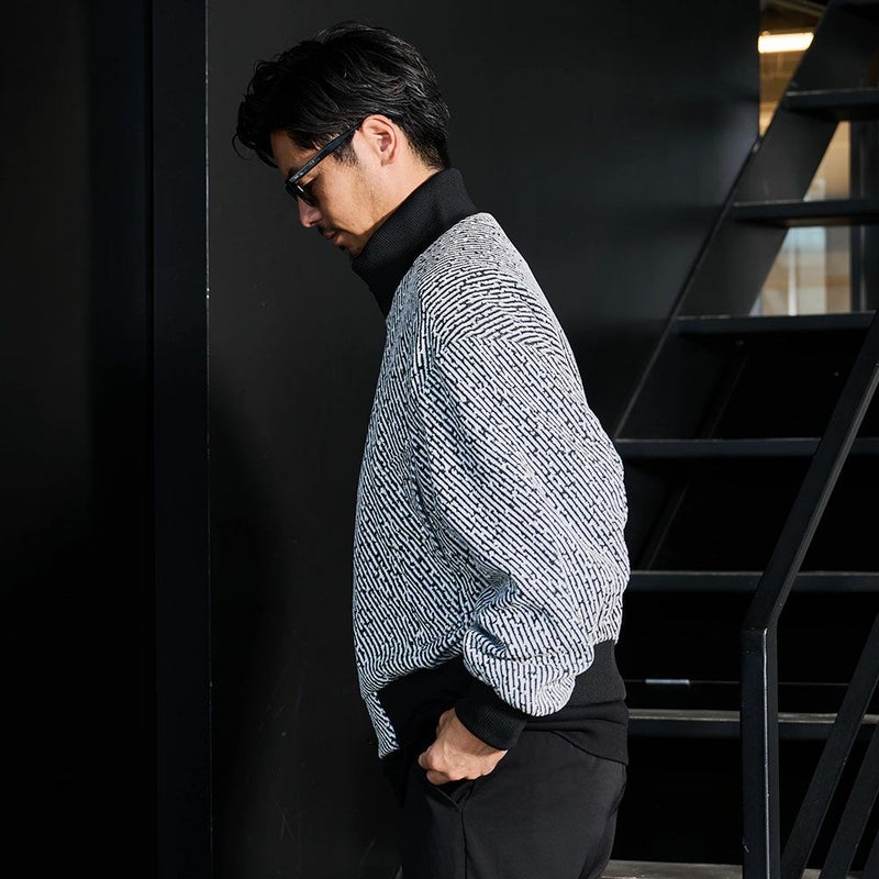 立体的な編地に繊細なラメを織り交ぜ、光の角度で表情を変えるモードな仕上がりが魅力。