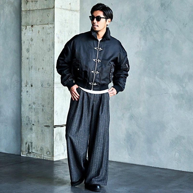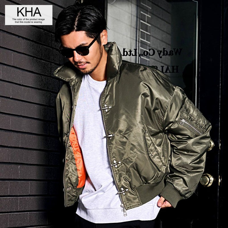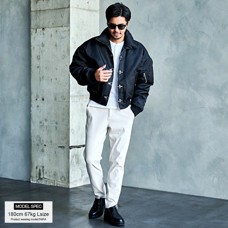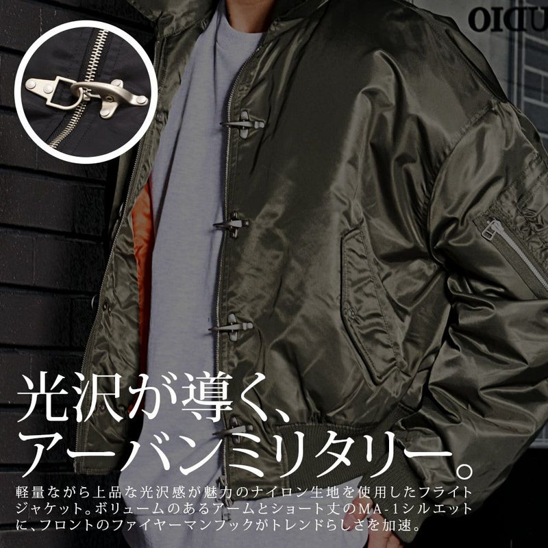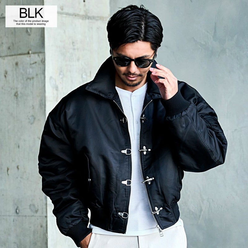 ボリュームのあるアームとショート丈のMA-1シルエットに、フロントのファイヤーマンフックがトレンドらしさを加速。