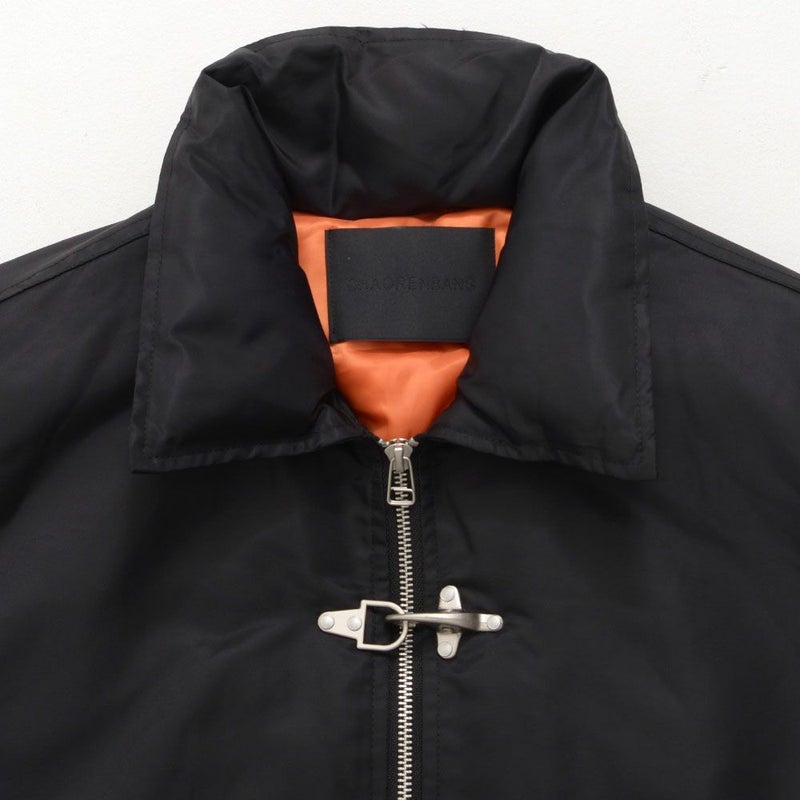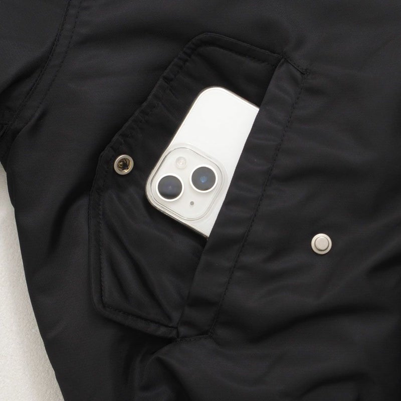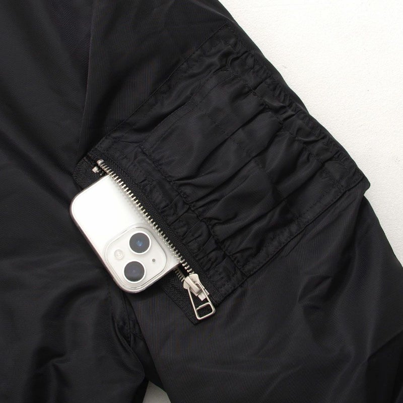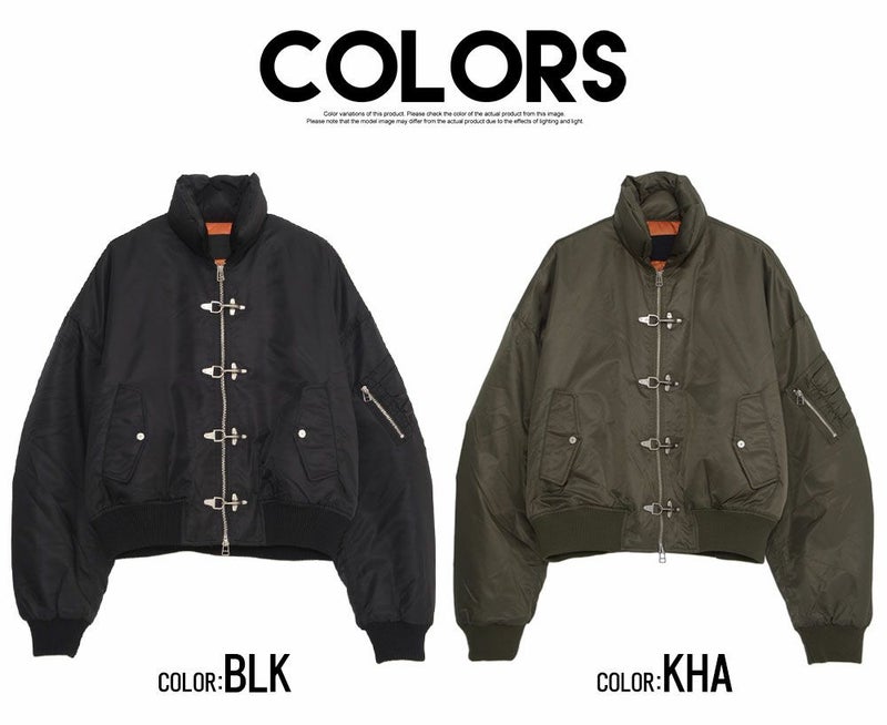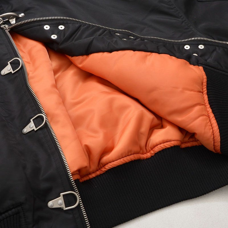 ボリュームのあるアームとショート丈のMA-1シルエットに、フロントのファイヤーマンフックがトレンドらしさを加速。