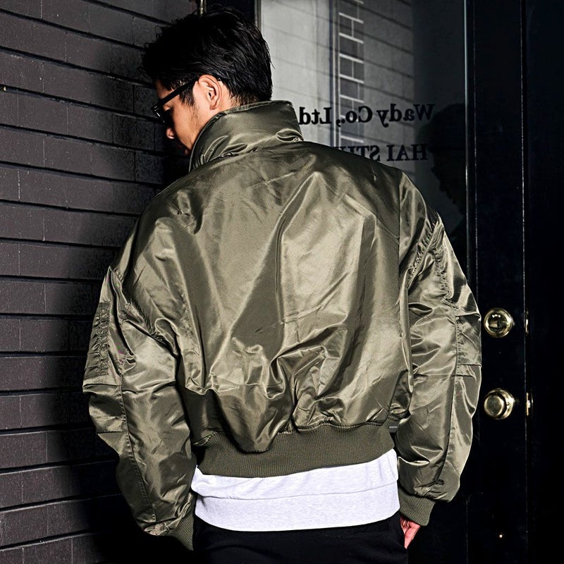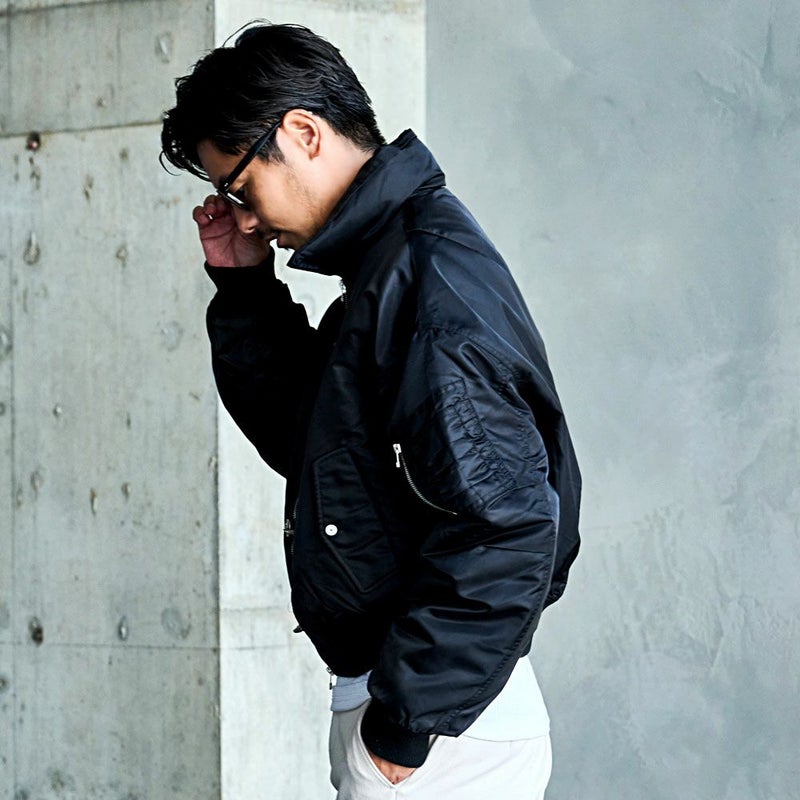 軽量ながら上品な光沢感が魅力のナイロン生地を使用したフライトジャケット。