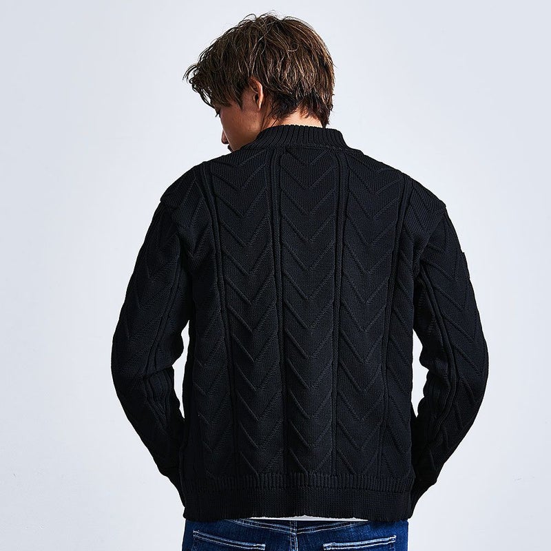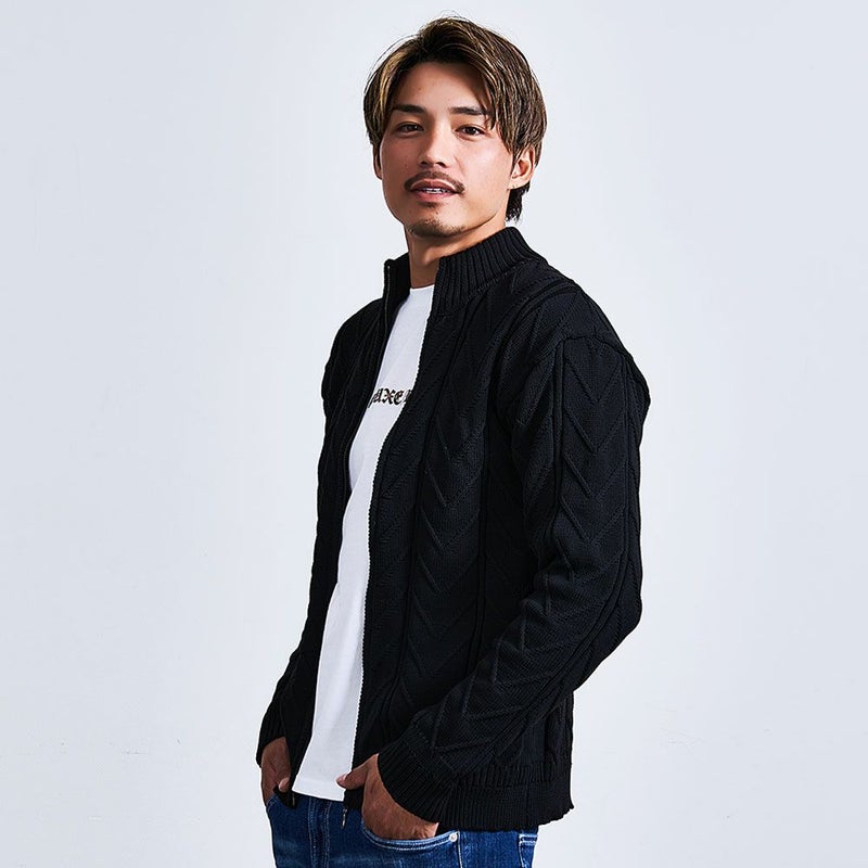 立体感のあるケーブル編みを全面にあしらい、コーディネートにアクセントを添えるニットブルゾン。