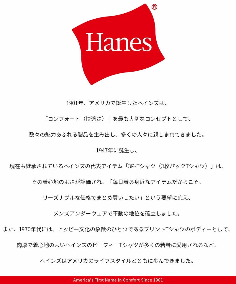 1947年に誕生し、現在も継承されているヘインズの代表アイテム「3P-Tシャツ(3枚パックTシャツ)」は、その着心地のよさが評価され、 「毎日着る身近なアイテムだからこそ、リーズナブルな価格でまとめ買いしたい」という要望に応え、メンズアンダーウェアで不動の地位を確立しました。
