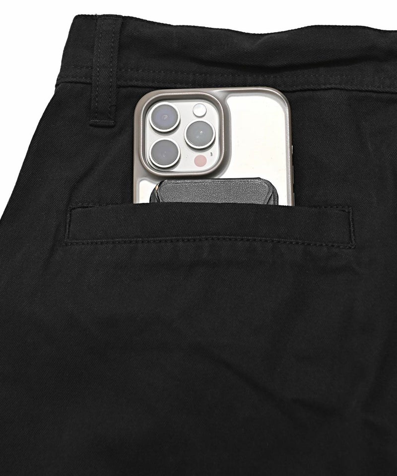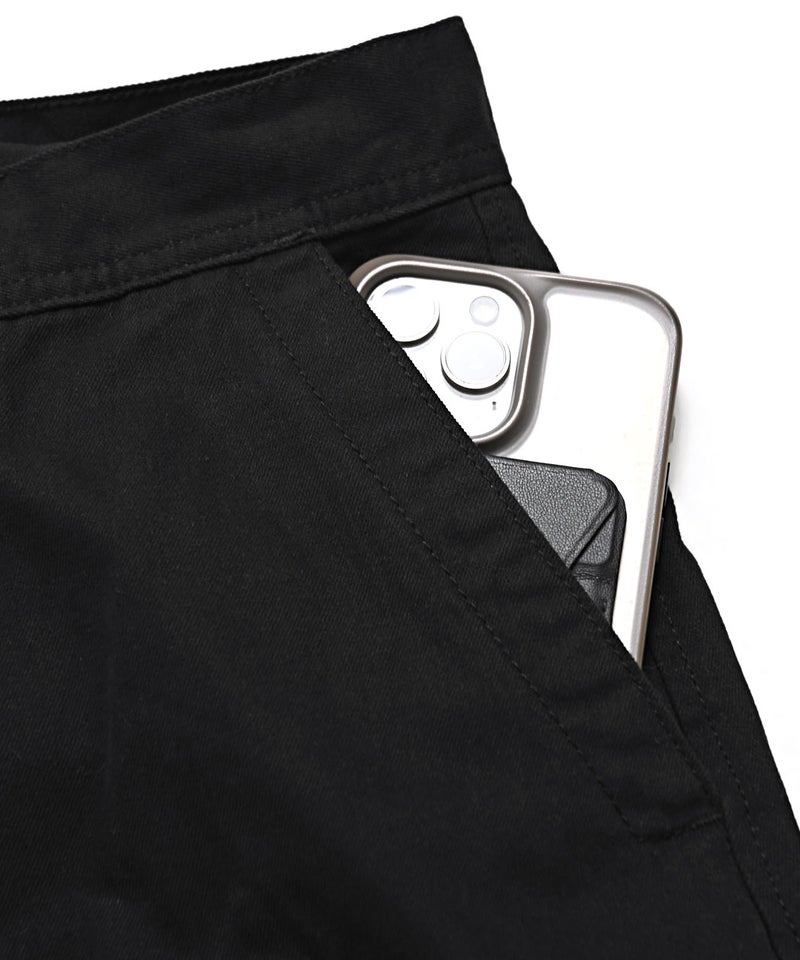 フロントは手を入れやすい縦型のスラッシュポケット、バックはすっきりとした印象の片玉縁ポケットを配置。