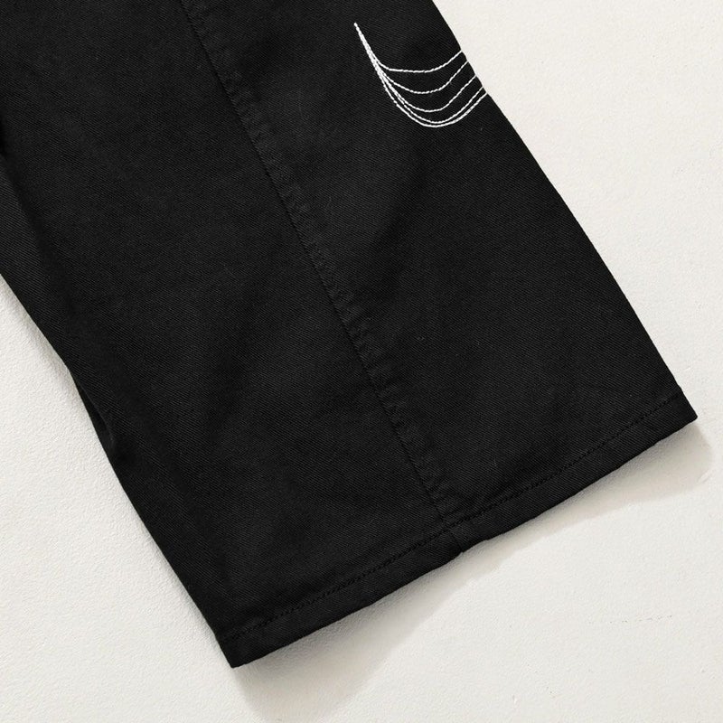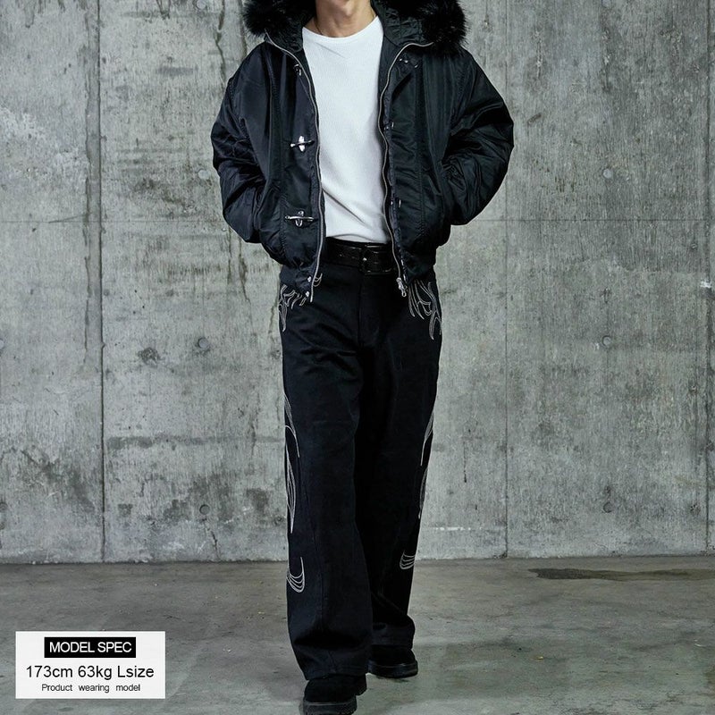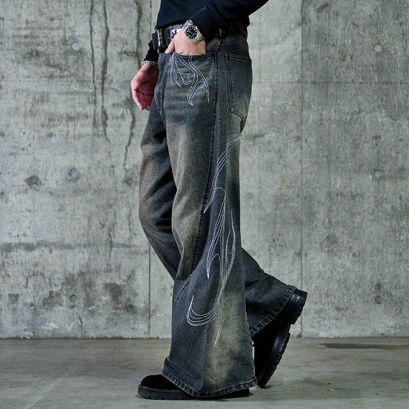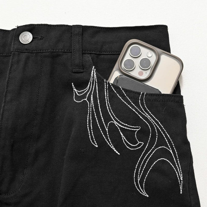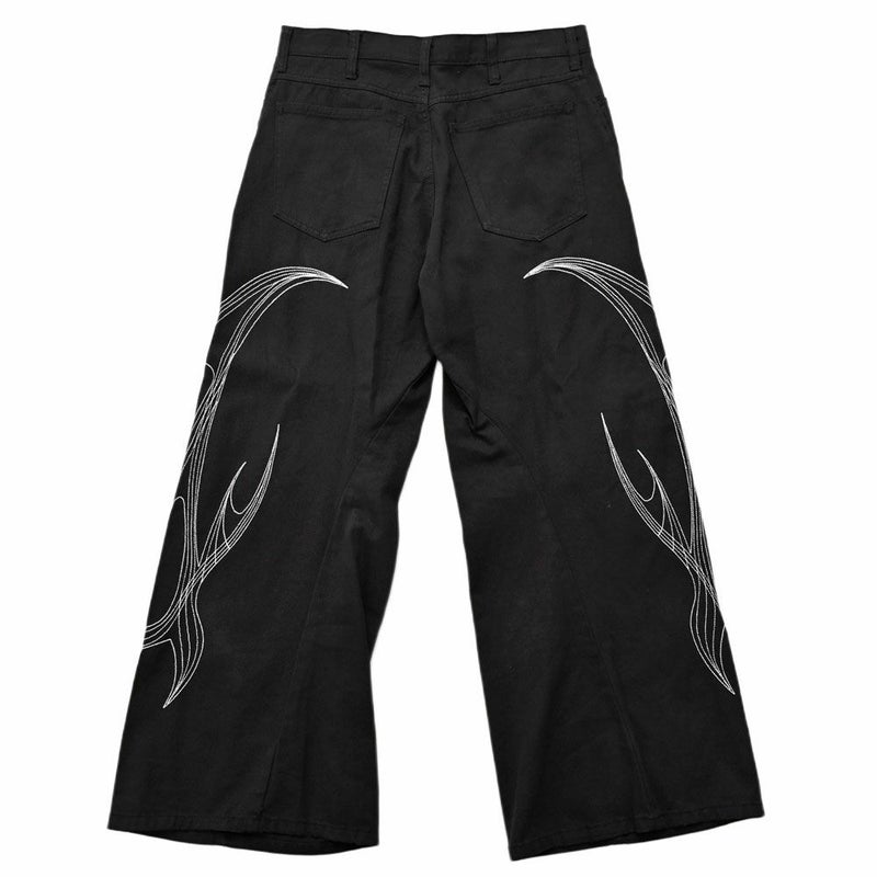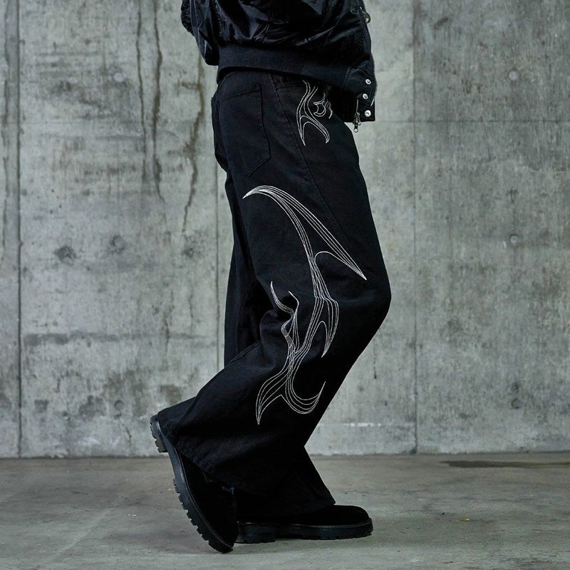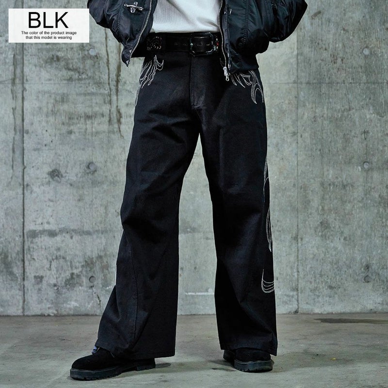 存在感のある刺繍デザインが目を惹くカーブシルエットパンツの登場です。