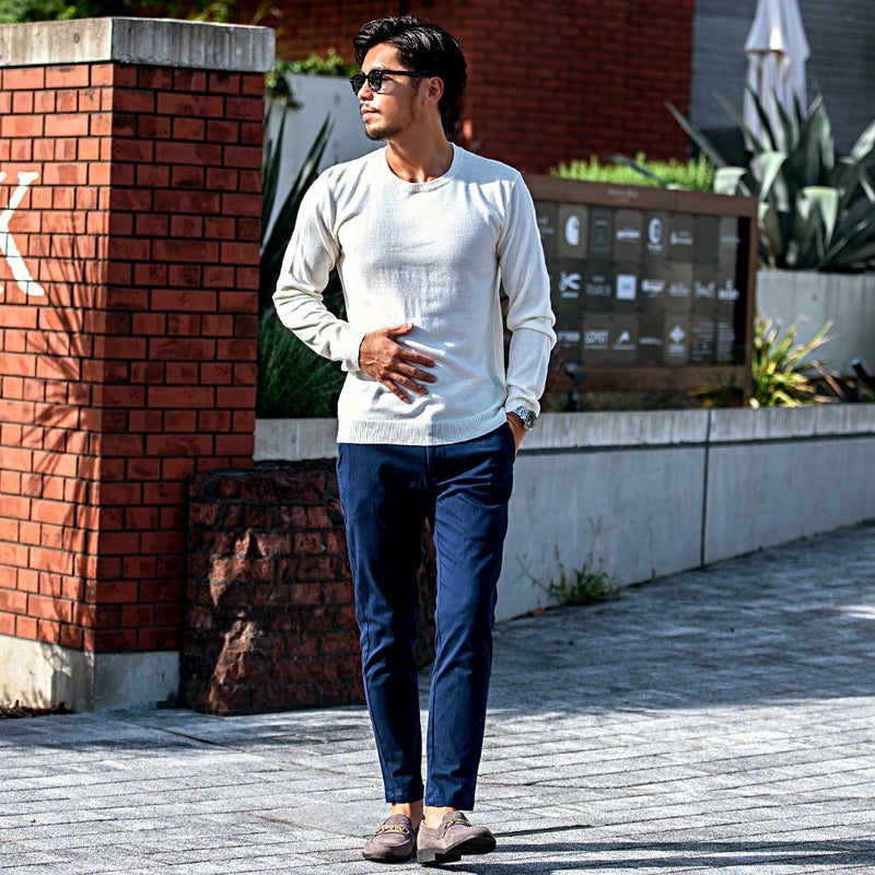 シンプルなデザインで合わせやすく、カジュアルからきれいめまで幅広いコーディネートに使えるオススメのチノパンです。