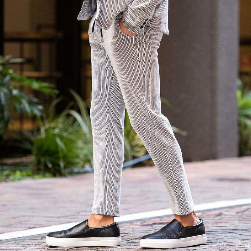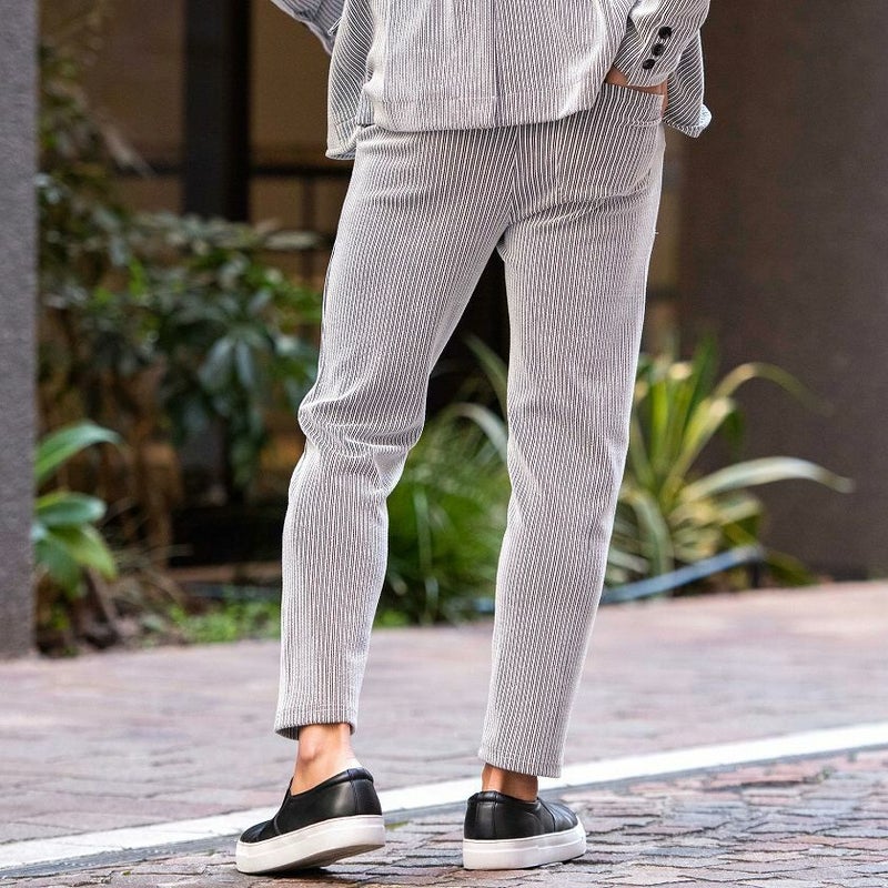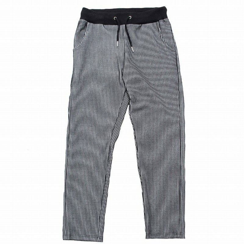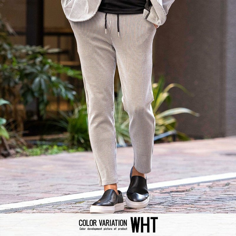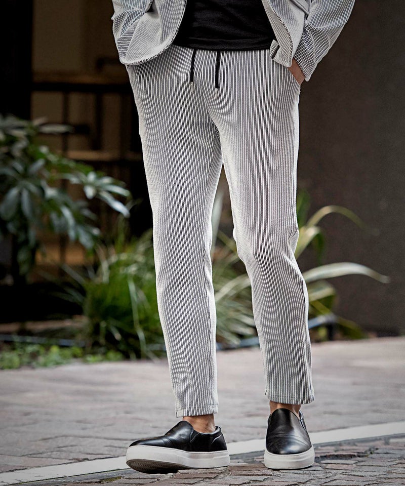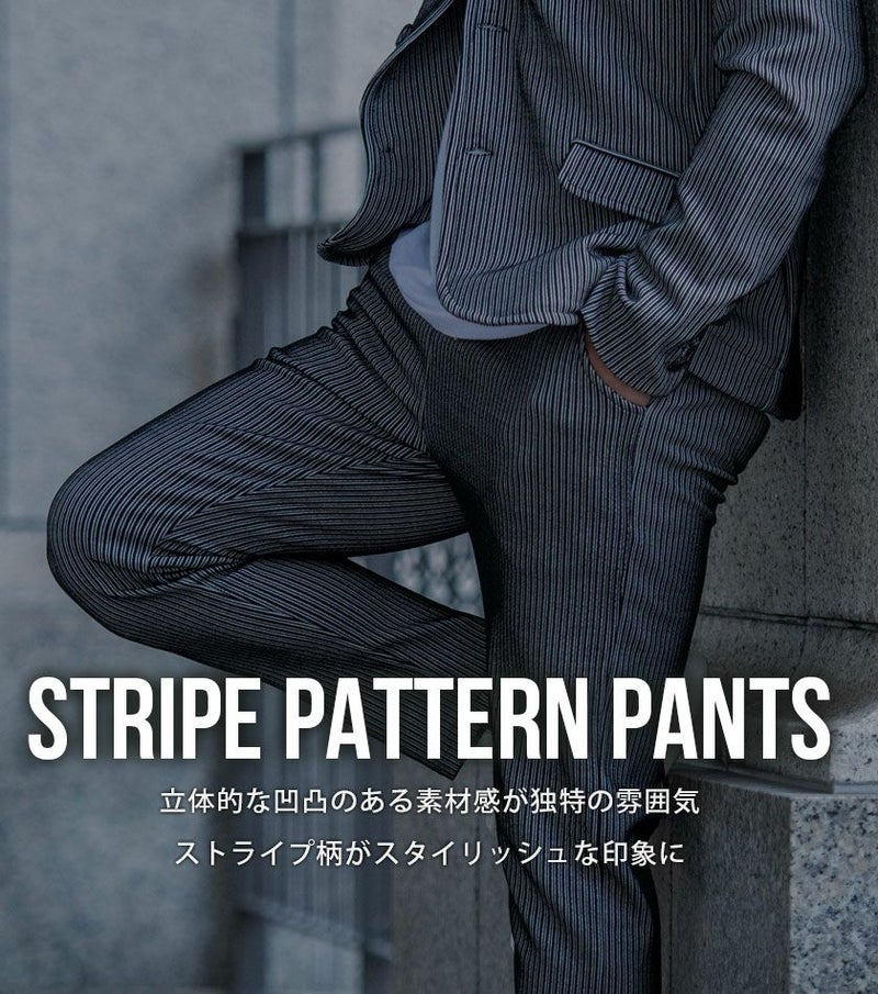 立体的な凹凸のあるストライプ柄を表面にほどこした生地感が贅沢な雰囲気を演出してくれるストライプパンツ。