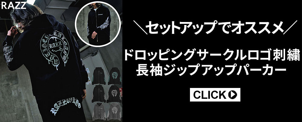 バックにはアーチロゴと、ダガー×薔薇を組み合わせたRAZZISオリジナルモチーフをプリントで大胆にデザイン。