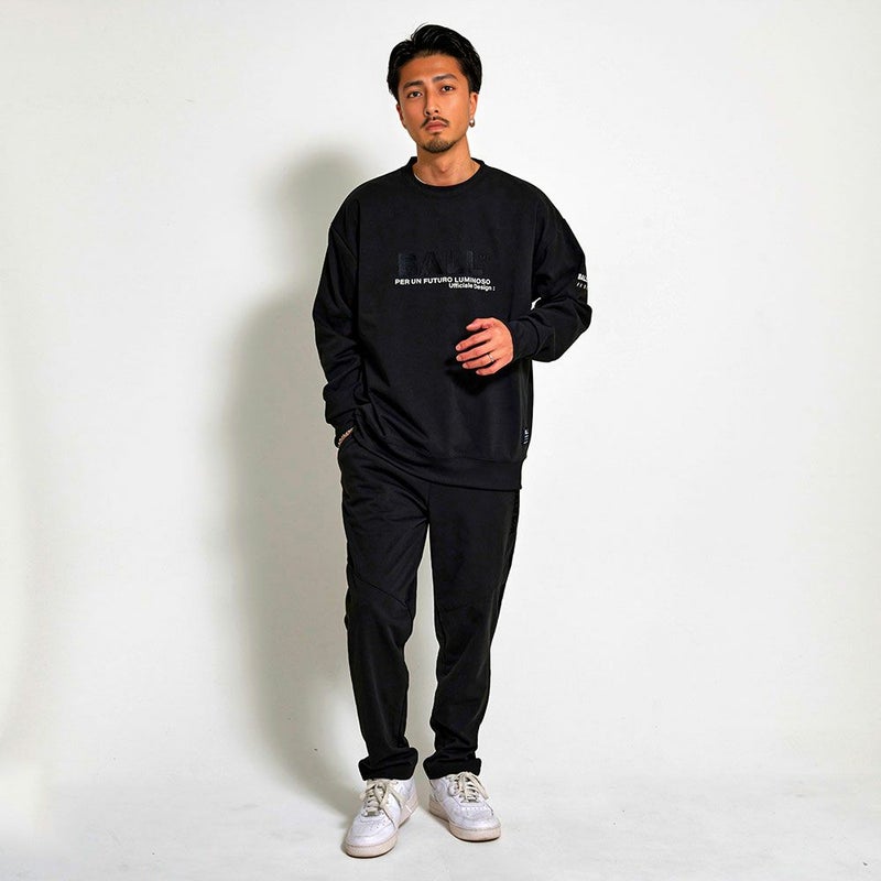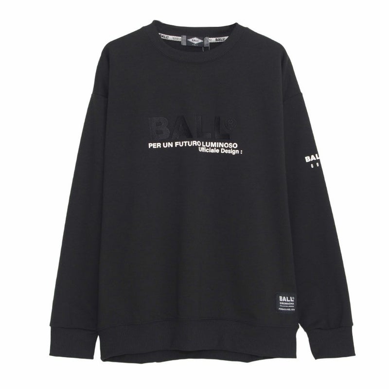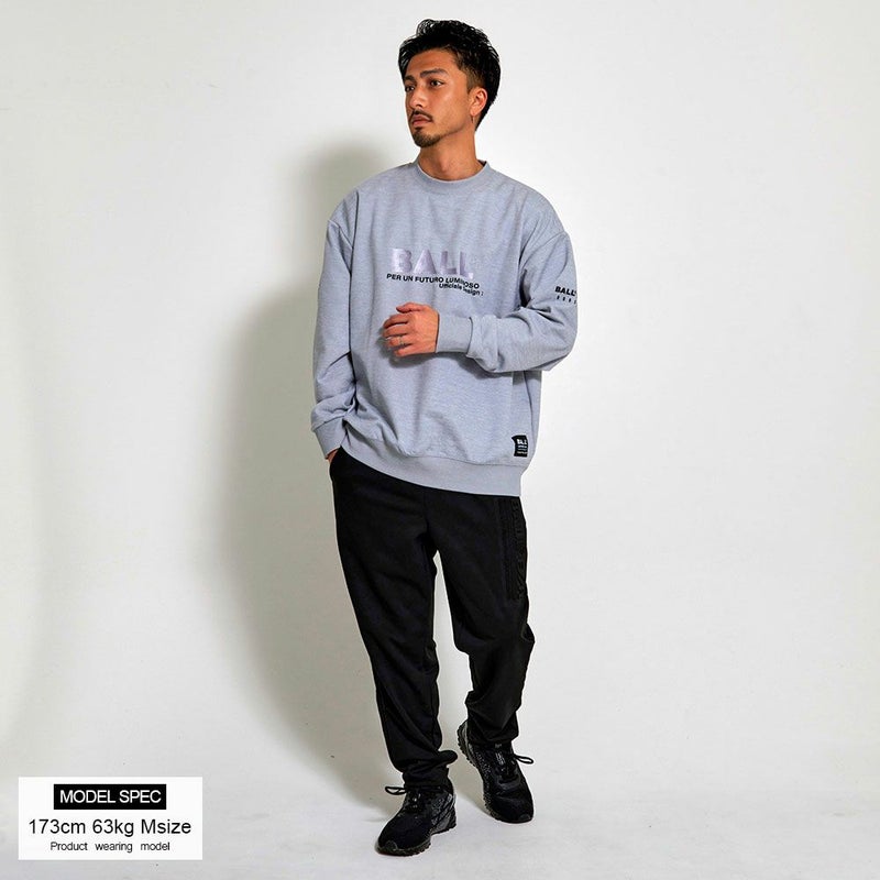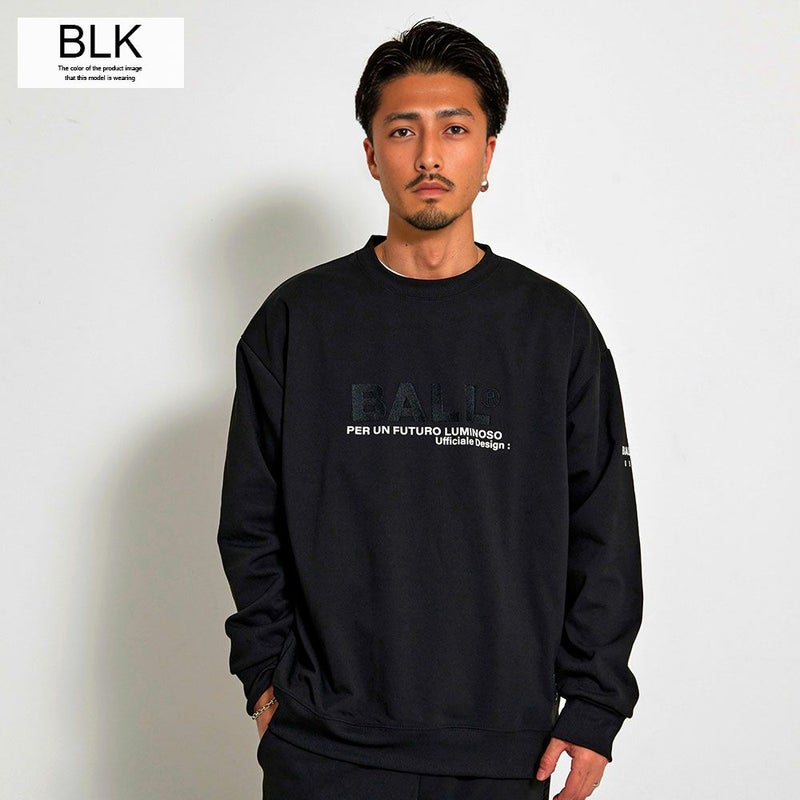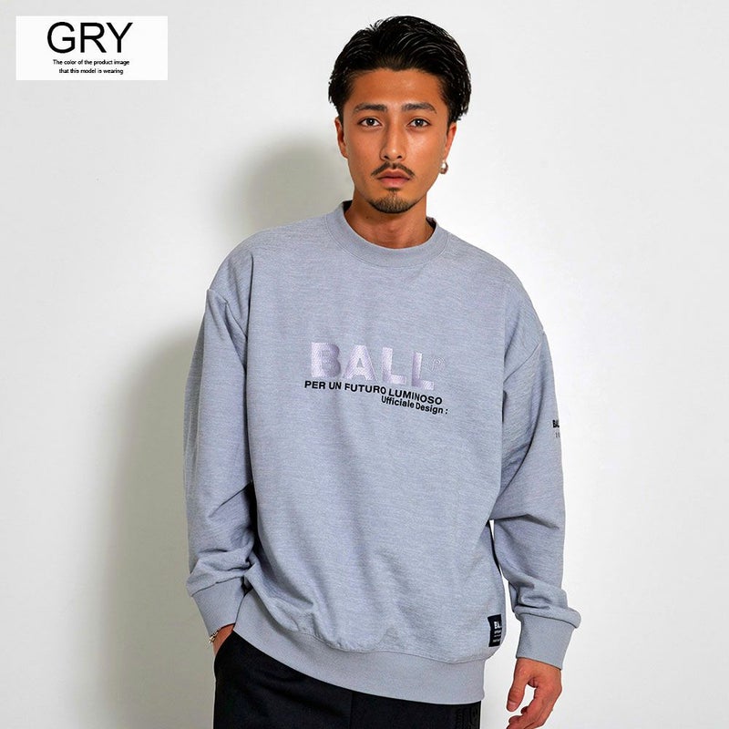 立体感のあるロゴ刺繍が、視覚的なインパクトを与え、他にはないユニークなデザインを演出。シンプルながら洗練された仕上がりで、コーデにさりげないアクセントをプラス。 BALL(ボール)クルーネック ストレッチダンボール刺繍プリント長袖トレーナー/全2色