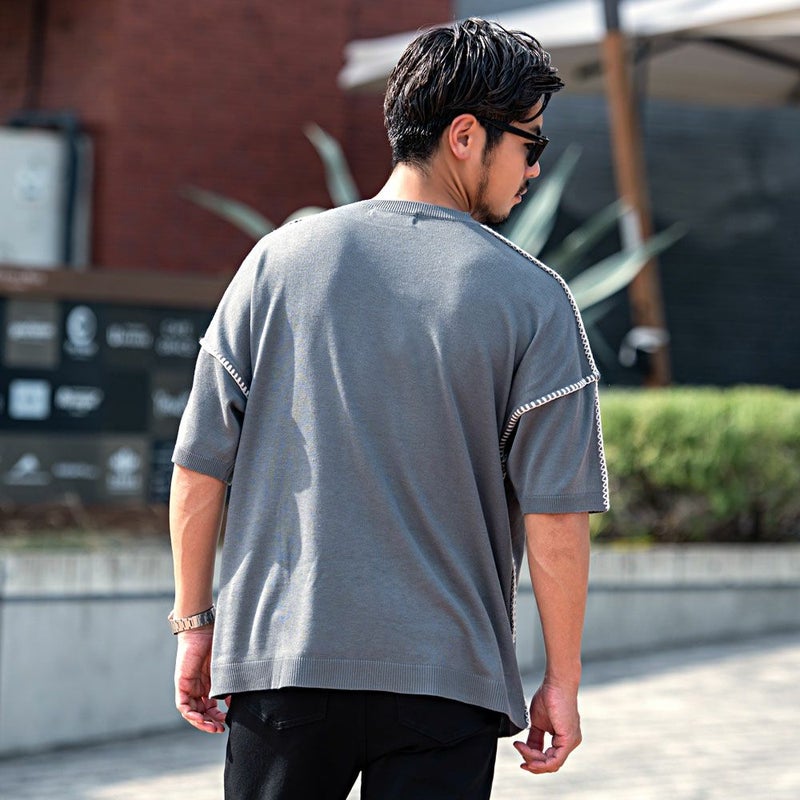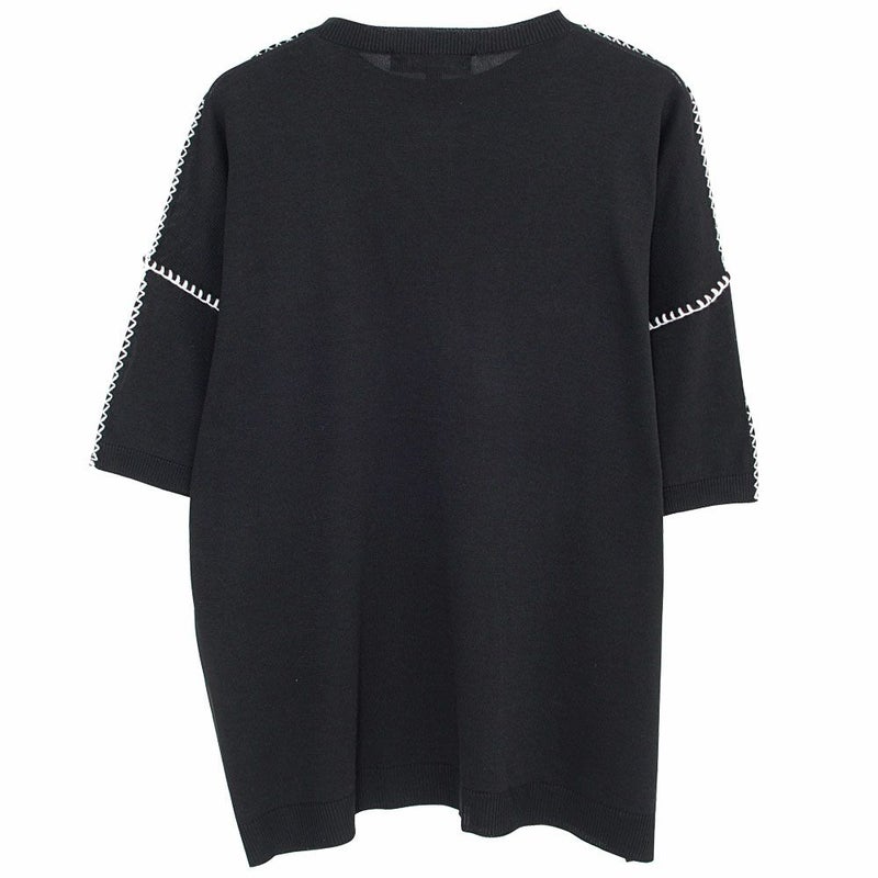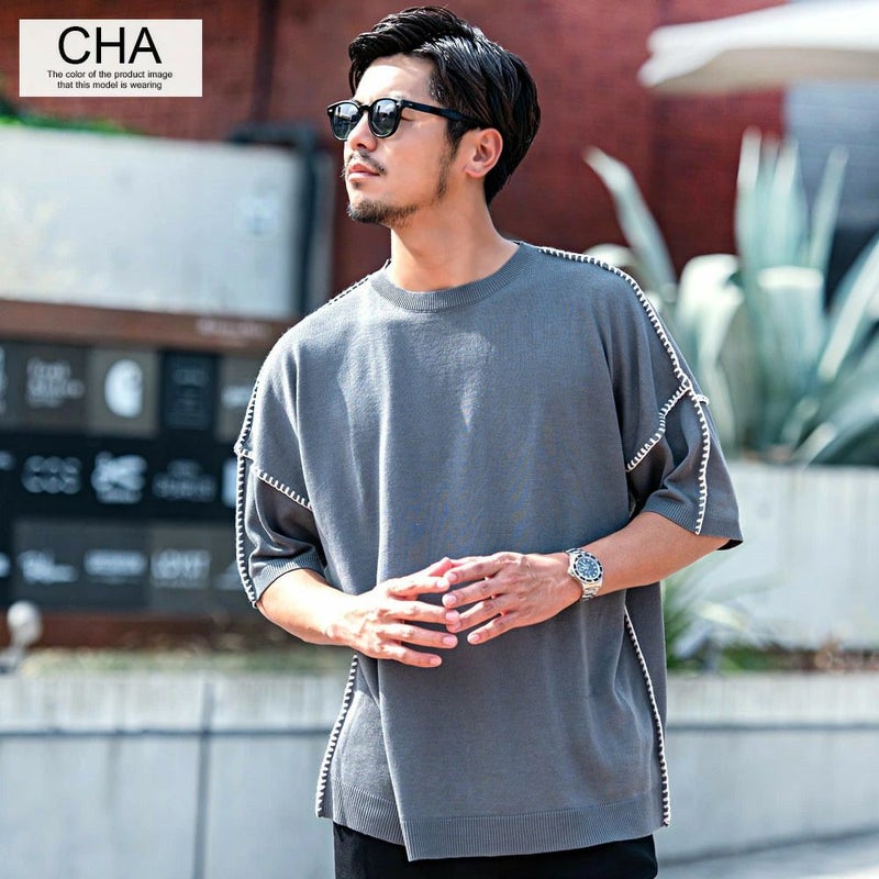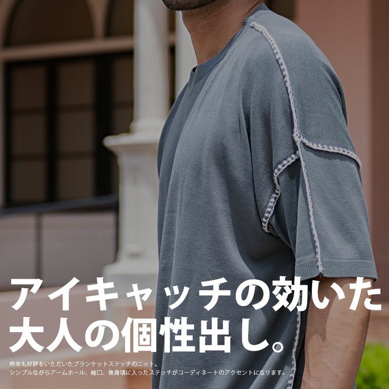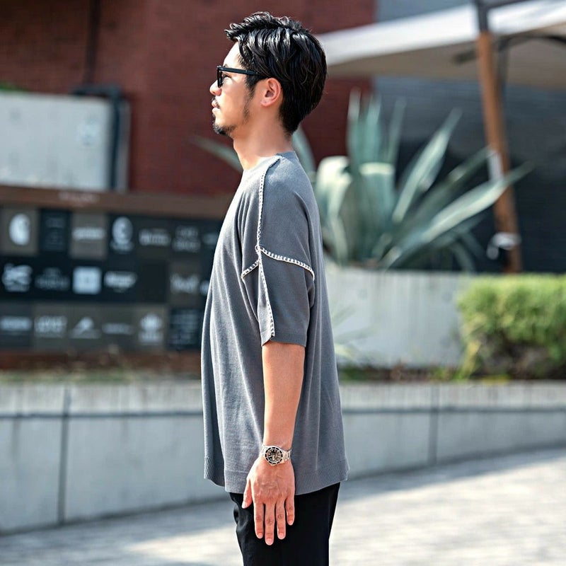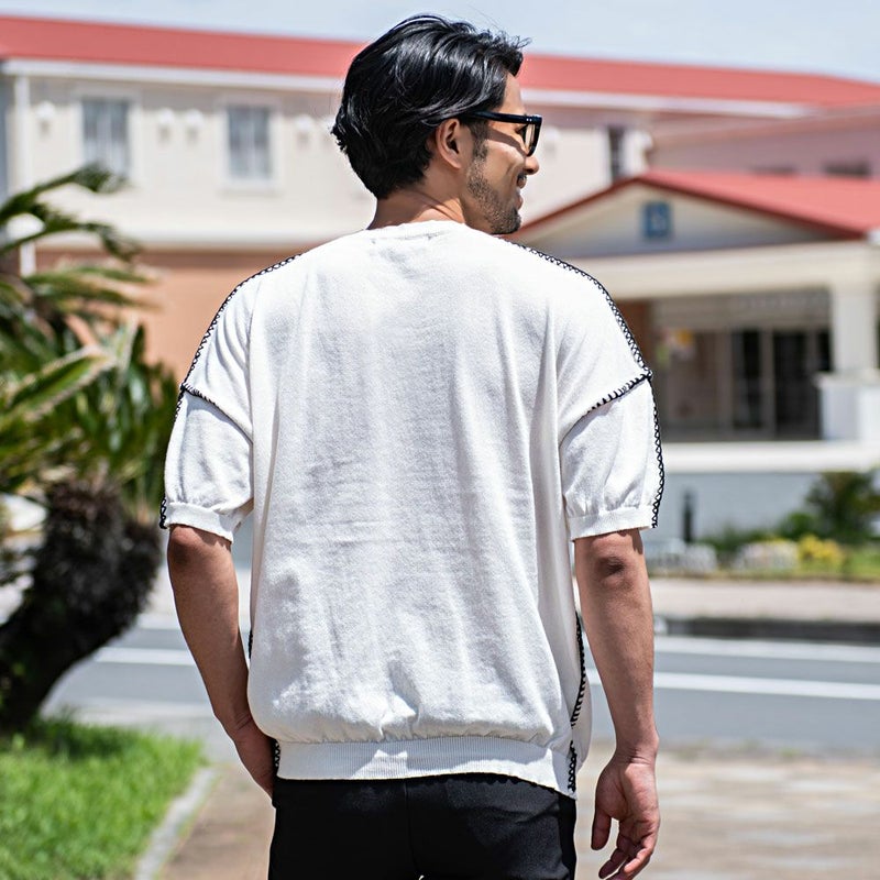 シンプルながらアームホール、袖口、後身頃に入ったステッチがコーディネートのアクセントになります。ハイゲージの柔らかな素材感で、ラフになり過ぎず着心地の良さにこだわった1着。 CavariA(キャバリア)ブラインドステッチ半袖ニット/全3色