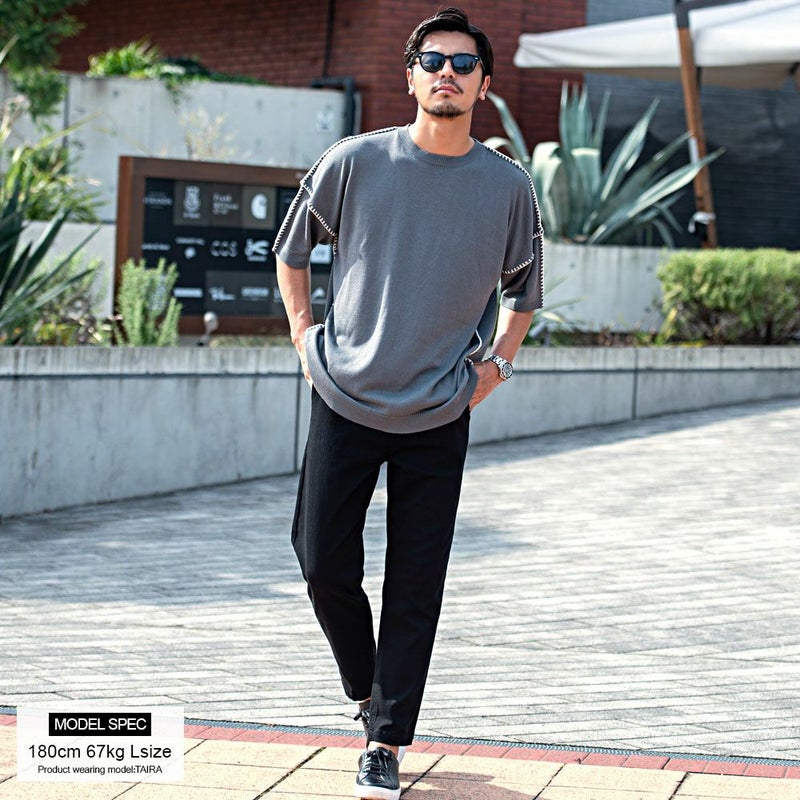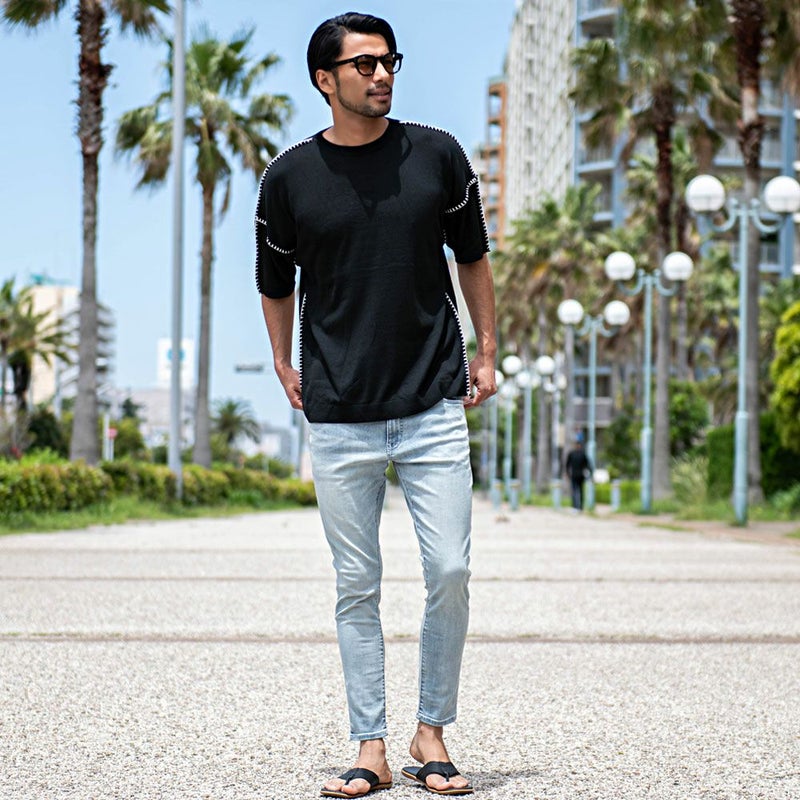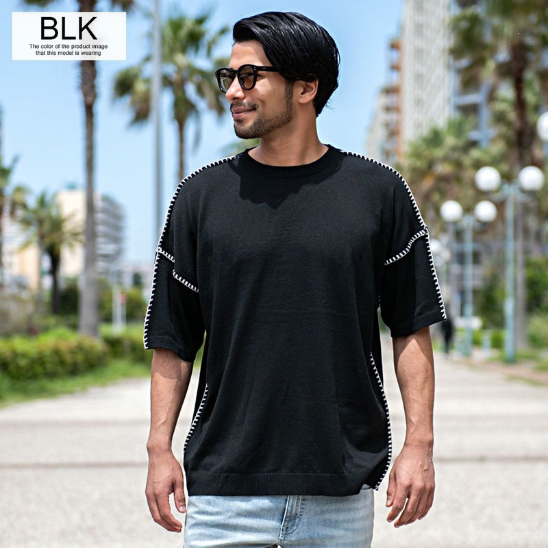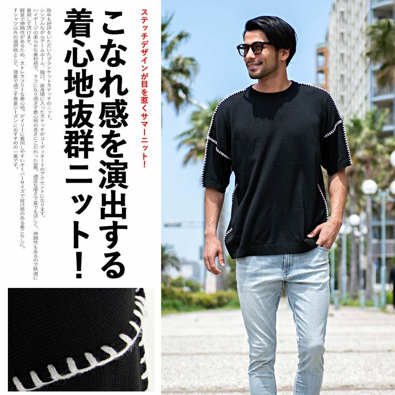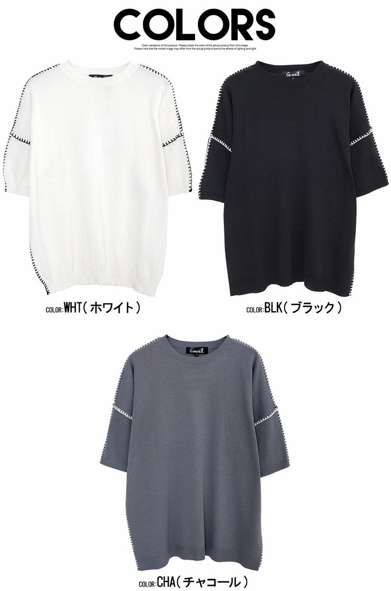 シンプルながらアームホール、袖口、後身頃に入ったステッチがコーディネートのアクセントになります。ハイゲージの柔らかな素材感で、ラフになり過ぎず着心地の良さにこだわった1着。 CavariA(キャバリア)ブラインドステッチ半袖ニット/全3色