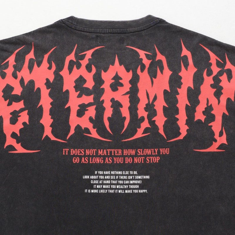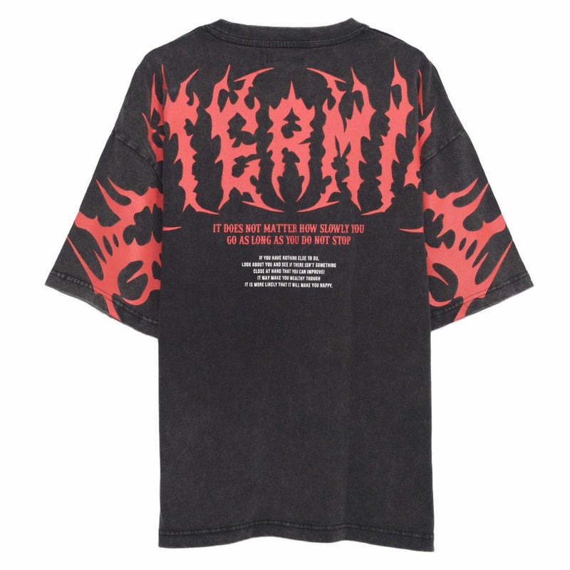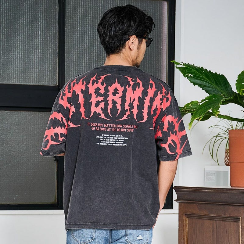 インパクトのあるトライバルフォントのプリントが、スタイリングにエッジをプラス。