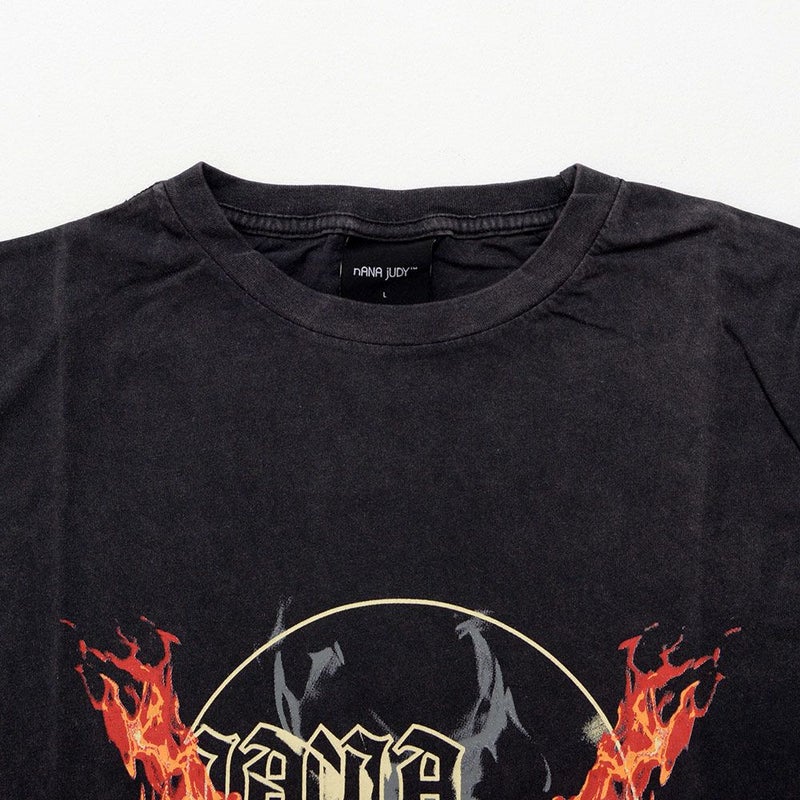 存在感抜群。燃え上がるようなグラフィックで魅せる、NANA JUDYのロング丈Tシャツ。