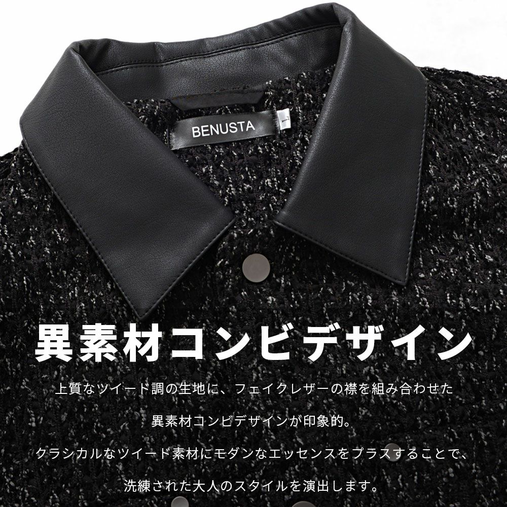 他の画像を見る 送料無料 上品さとモード感を兼ね備えた「PU襟ツイードジャケット」。上質なツイード調の生地に、フェイクレザーの襟を組み合わせた異素材コンビデザインが印象的。 【送料無料】BENUSTA(ベヌスタ)PU襟ツイードジャケット/全1色 販売価格 ¥ 14,080 税込 在庫切れ カートに入れる お気に入りに登録する