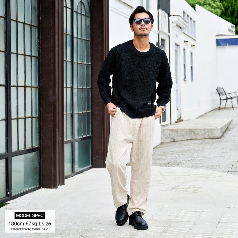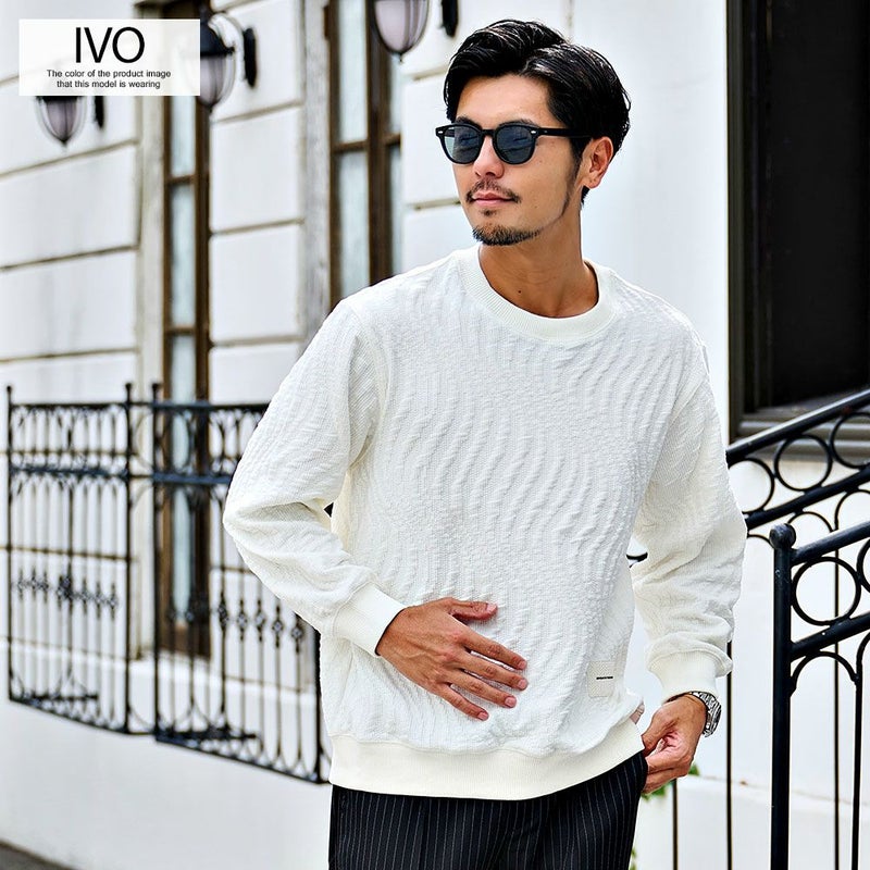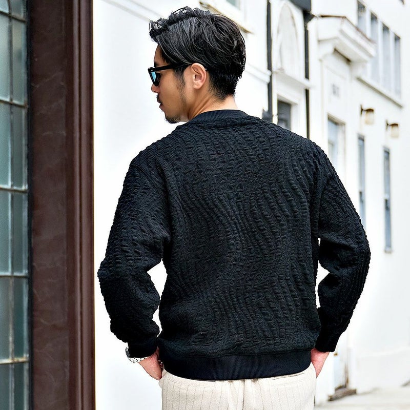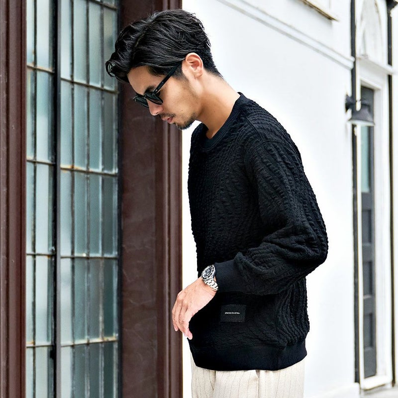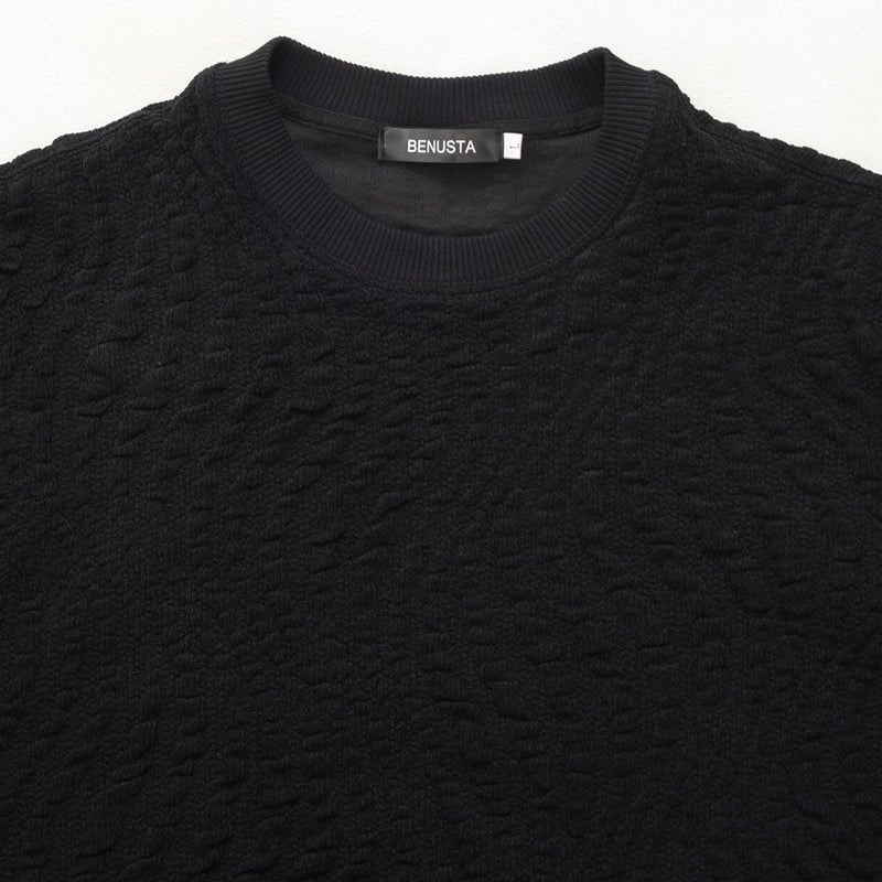 立体感のあるジャガードが魅せる上品な存在感。大人の余裕とストリート感を両立したモードなトレーナー。 BENUSTA(ベヌスタ)ウェーブ柄トレーナー/全2色