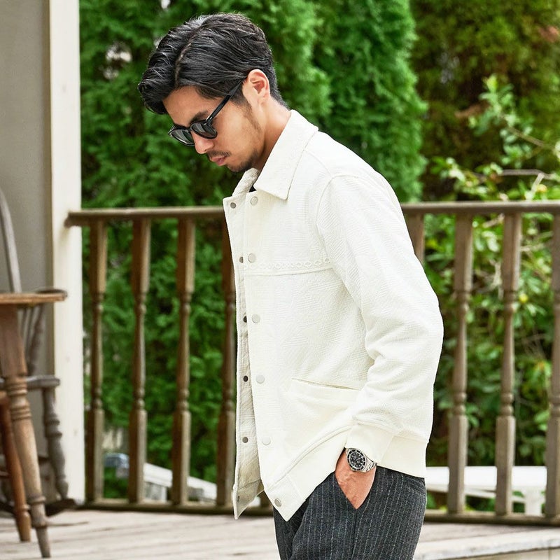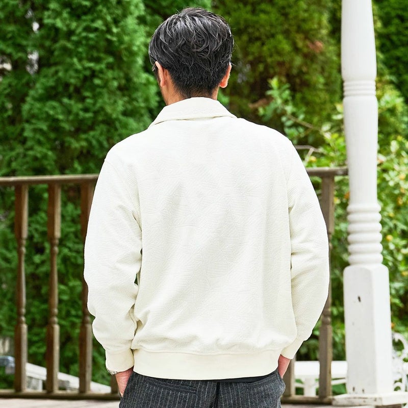 立体感のあるジャガード素材で仕立てた上品なジャケット。