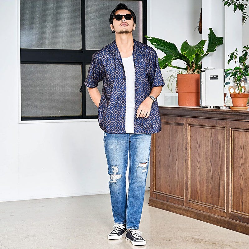 一枚で存在感を放つ総柄デザインの半袖シャツ。